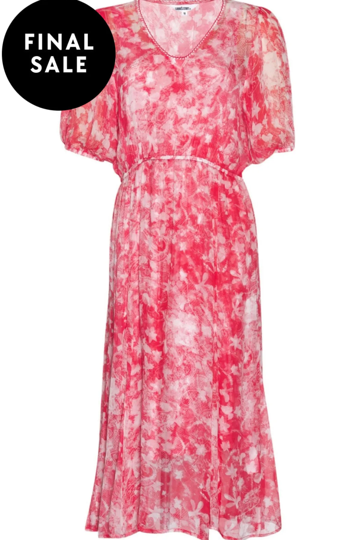 Sheer midi dress with a V-neckline and embroidery stitch detail around the neck edge, with elasticated waist and short blouson sleeves elasticated at the cuff. Includes a matching A-line slip. Perfect for your summer parties, weddings and events!