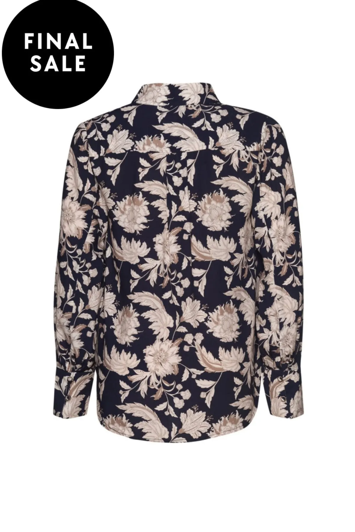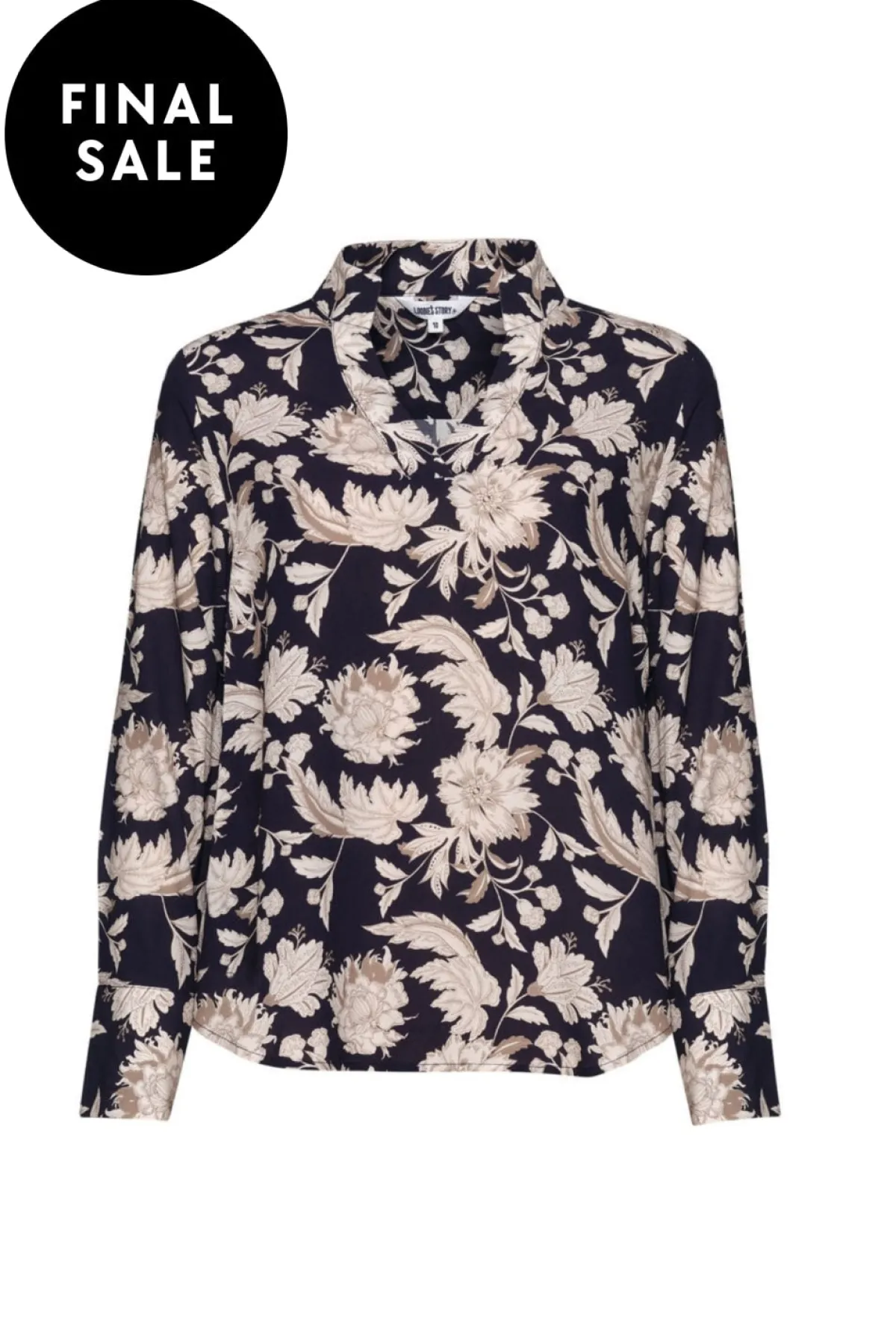 Relaxed fit blouse with a V-neckine and upstanding back collar. Deep cuffs with self-covered buttons. Hemline dips at the back.