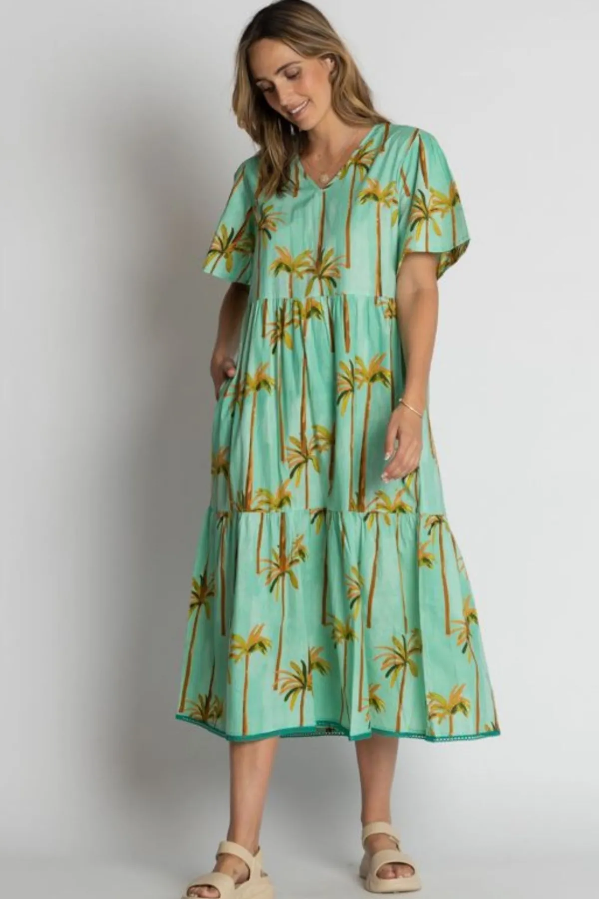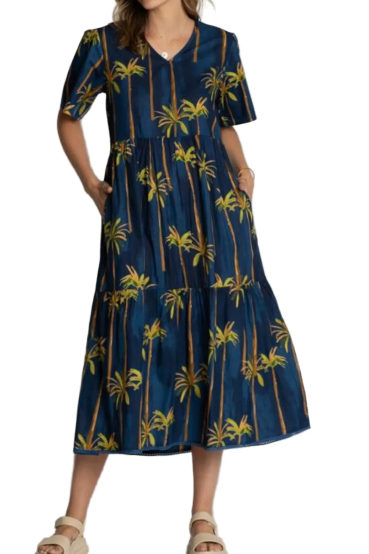 The Lula Life Badira Midi Dress is the perfect mix of comfort and tropical charm. Designed in Australia and made from 100% cotton, this below-calf length dress features a relaxed fit with elbow-length sleeves and practical side pockets. Tiered gathers create soft movement, while the braid trim on the hem adds a stylish finish. Showcasing a vibrant tropical palm tree digital print, this lightweight cotton midi dress is ideal for summer holidays, beach escapes, or relaxed everyday wear.