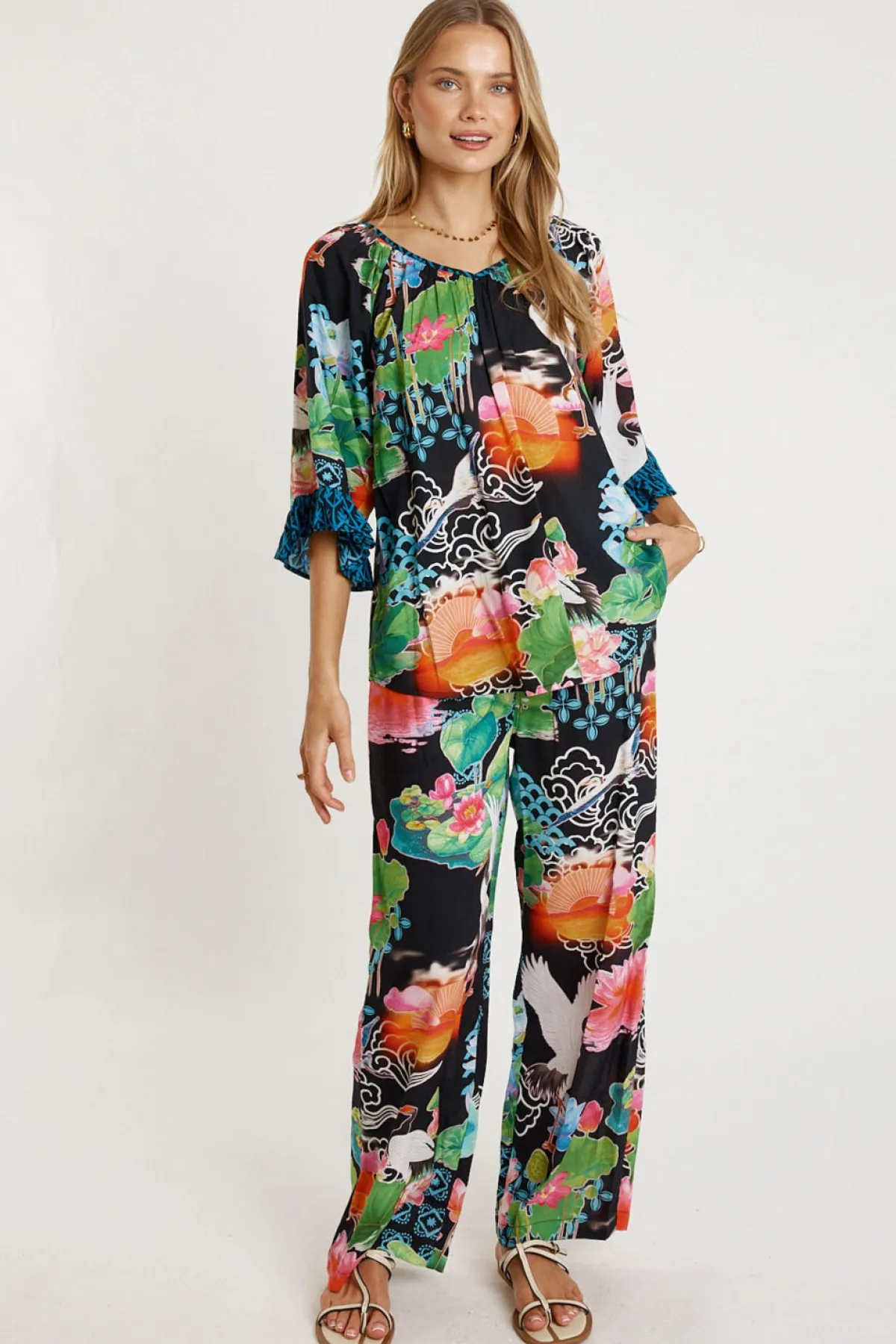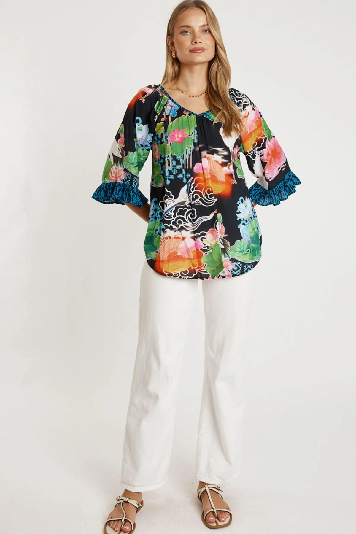 Blending comfort with standout detail, the Lula Life Akiko Top brings easy, everyday style with a touch of charm. Made from 100% viscose, this relaxed top feels soft and lightweight, perfect for warm days or laid-back outings. The V-neckline, gentle gathers, and wide raglan sleeves with a flounce hem give it a flowy, feminine look. Finished with a curved hem and a Japanese-inspired digital print, this Australian-designed piece pairs effortlessly with denim, linen, or your favourite summer pants for a bold yet easy vibe.