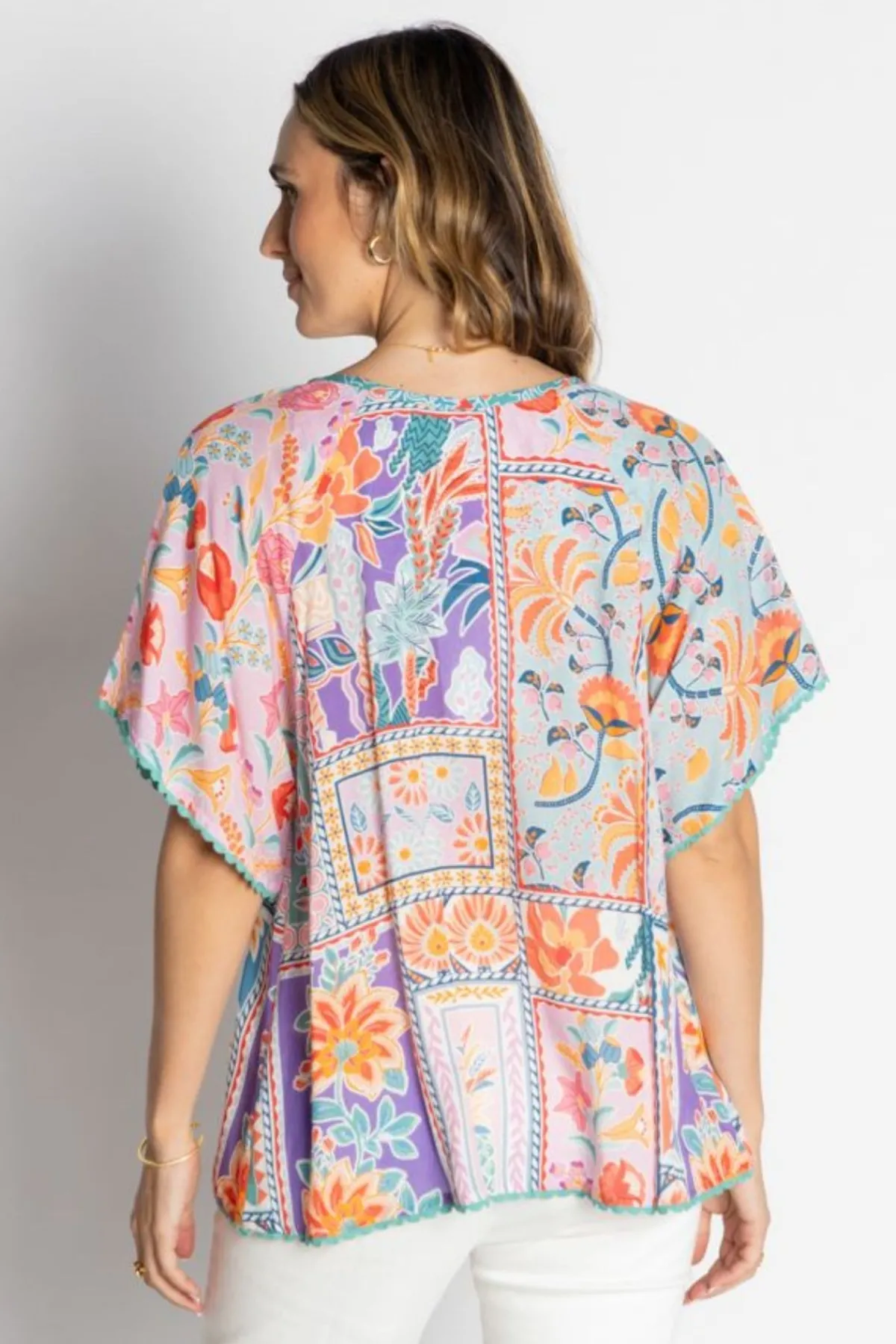 The LulaLife Zorana Top is a relaxed-fit, lightweight top crafted from 100% viscose and designed in Australia. Featuring a flattering V-neck and wide raglan sleeves to the elbow, it offers comfort and effortless style. Ric-rac braid trim on the hems adds playful detail, while mix-and-match patchwork digital prints bring vibrant, eye-catching character. Perfect for pairing with jeans, skirts, or shorts, this top is ideal for casual outings, summer days, or holiday wear.