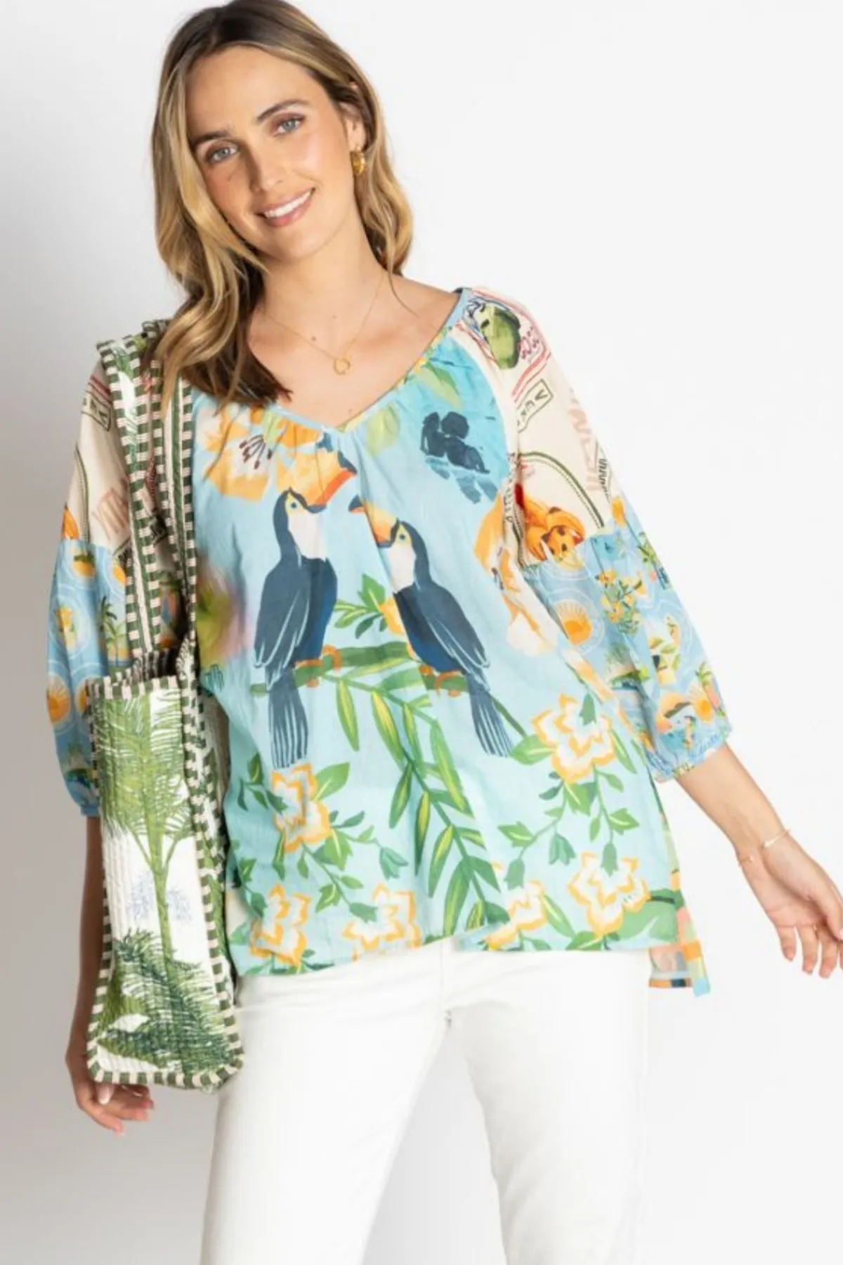 The EXOTICA TOP combines a playful toucan print with a relaxed tunic silhouette, perfect for summer gatherings. Its breezy fit ensures comfort while the vibrant design adds a touch of elegance to your party wardrobe. Ideal for effortless style with a sophisticated edge.