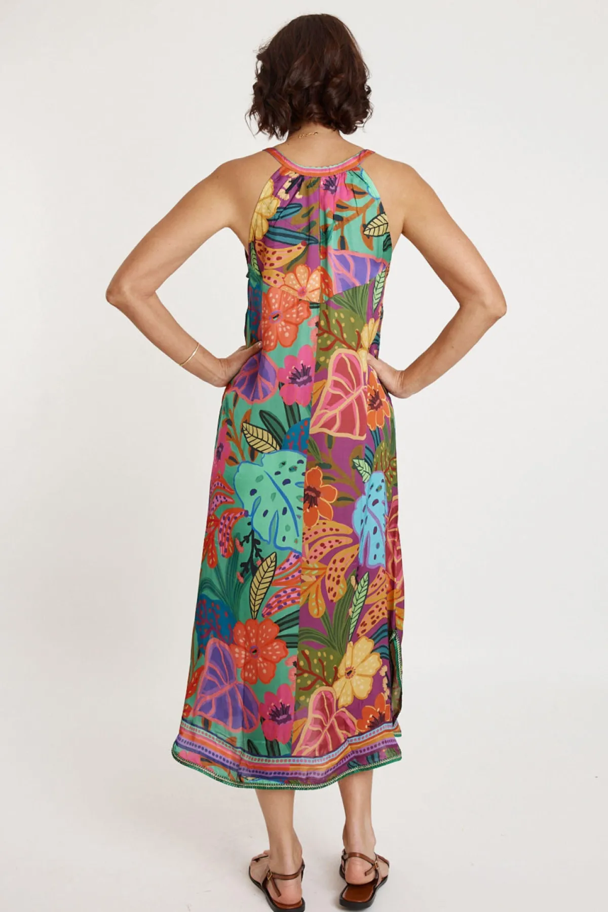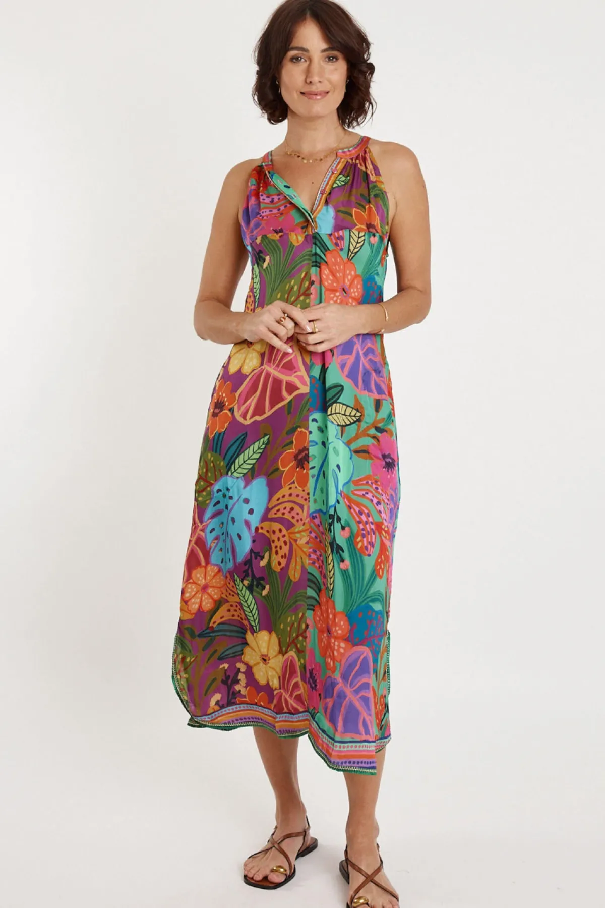 The Lula Soul Auberge Maxi Dress is a relaxed and versatile summer essential, designed in Australia and crafted from lightweight a viscose modal mix. Showcasing a vibrant tropical digital print, this maxi dress features an easy A-line shape for comfort and style. Side pockets add everyday practicality, while the curved hem creates a flattering silhouette. Finished with a decorative trim for a playful touch. Perfect for beach holidays, summer events, or relaxed weekends.