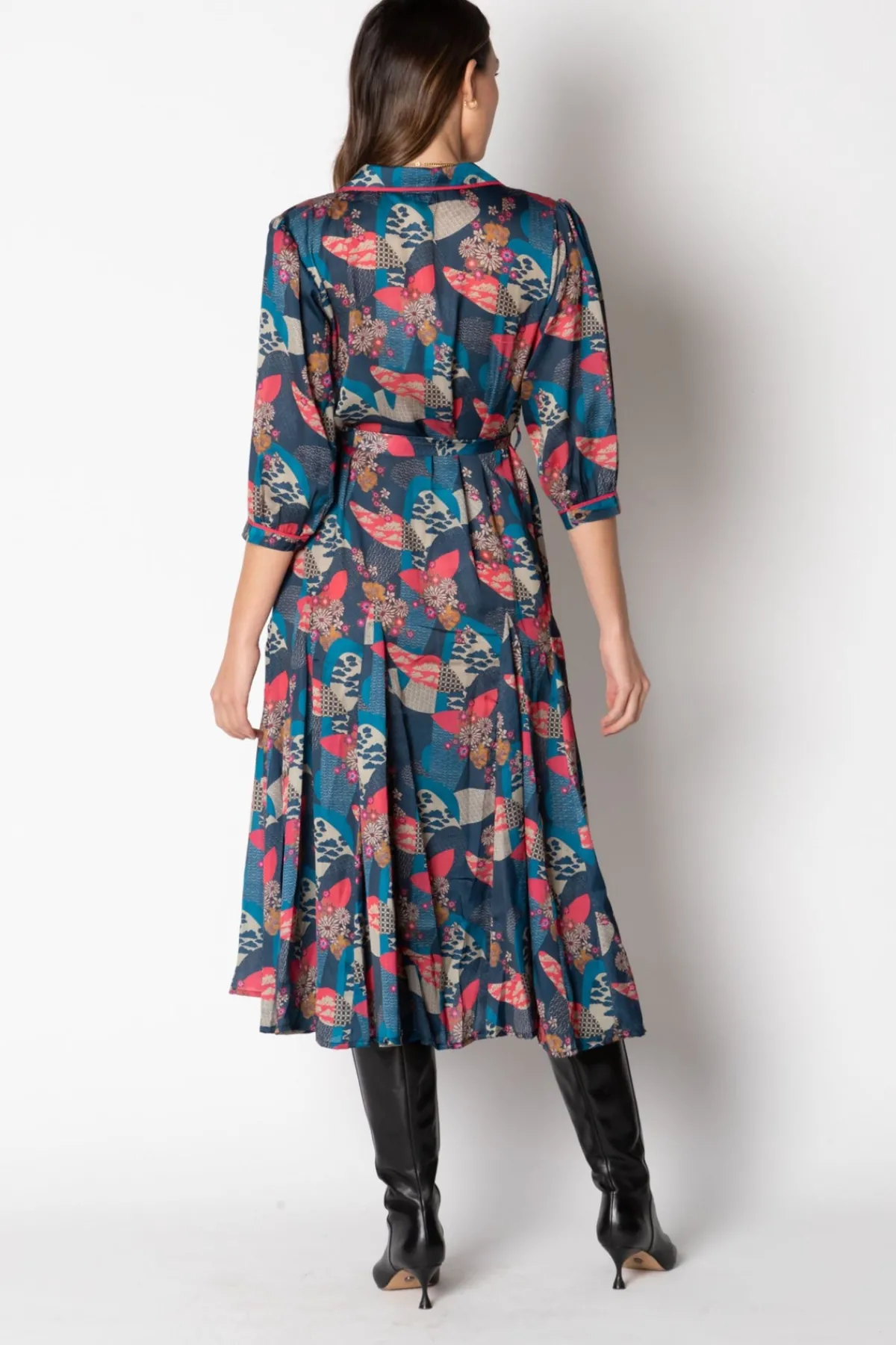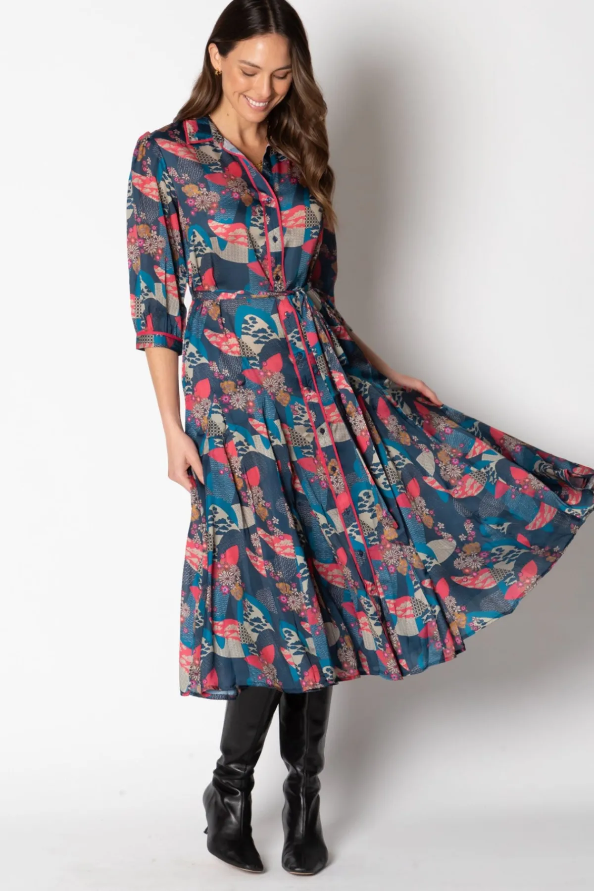 Indulge in the luxury of the Cadiz Midi shirt dress by Lula Soul. Elevate your style with the 3/4 sleeves, full gored skirt, and moonlight floral print. The cerise trim on the front opening and cuffs adds a touch of sophistication. Perfect for dancing the night away with elegance and grace.