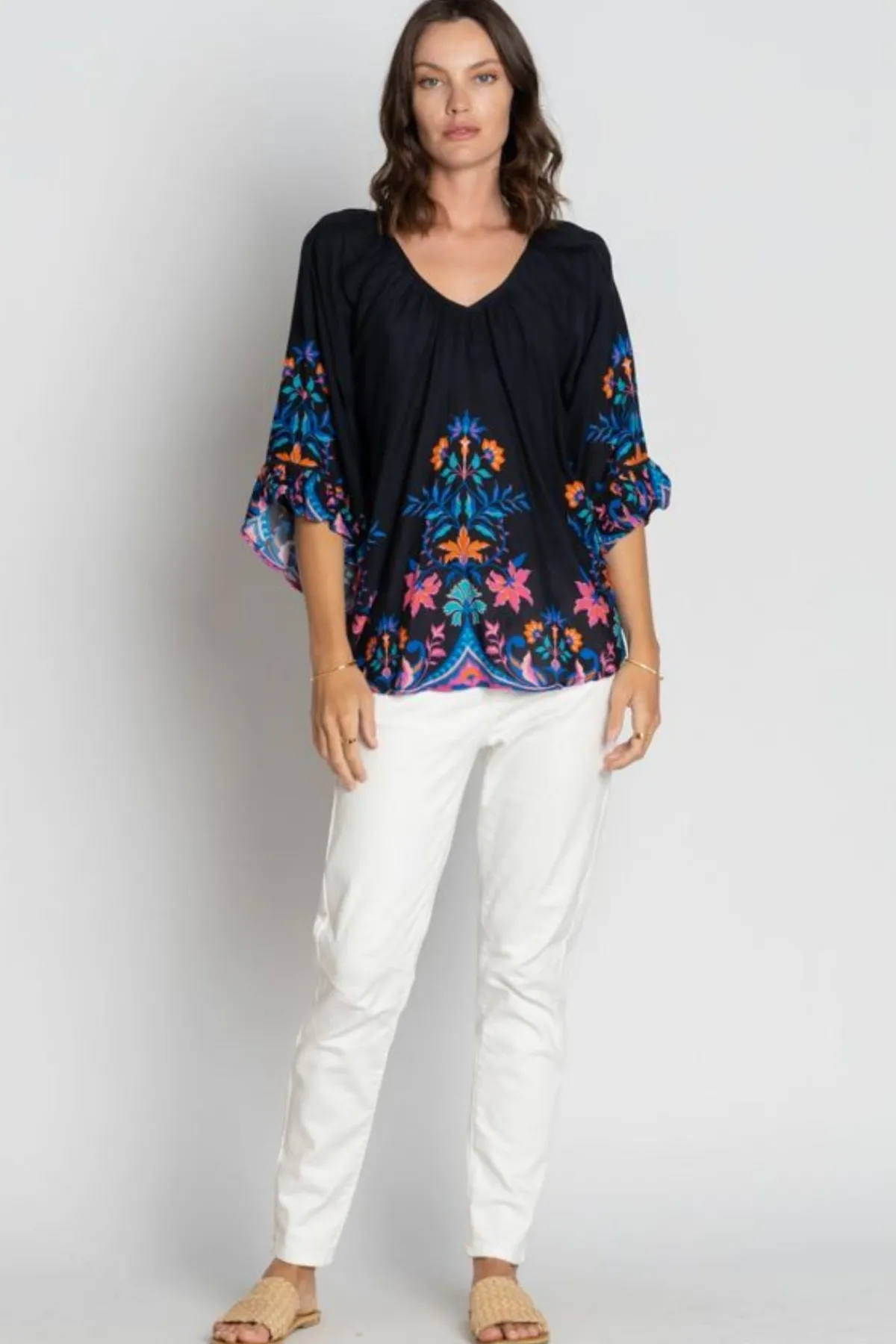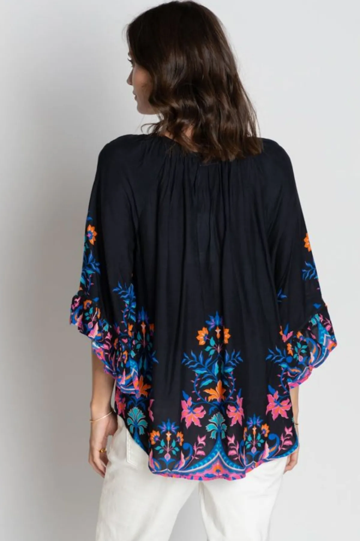 The Lula Soul Bahia Top is a breezy and stylish addition to your summer wardrobe. Crafted from soft 100% viscose modal, it features a flattering V-neckline with gentle gathers and wide raglan sleeves finished with ruffle hems. Ladder lace trim on the sleeves and a curved hemline add feminine detail, while the vibrant digital scarf placement print creates a standout look. Perfect for pairing with jeans, skirts, or shorts, this lightweight top brings effortless elegance to everyday wear and resort styling.