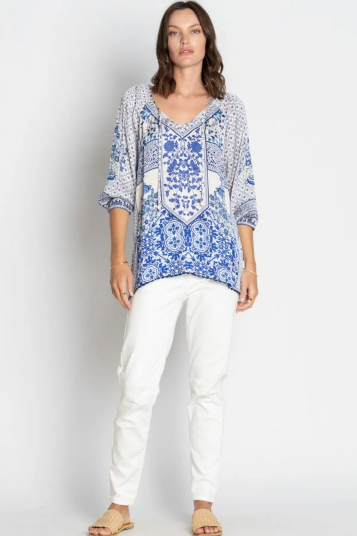 Crafted from luxuriously soft 100% satin modal, this relaxed-fit shirt features a flattering V-neckline with delicate gathers, wide raglan sleeves finished with ruffle hems, and intricate ladder lace trim.Perfect for pairing with jeans, skirts, or tailored pants, this shirt blends comfort, style, and timeless appeal for any occasion.