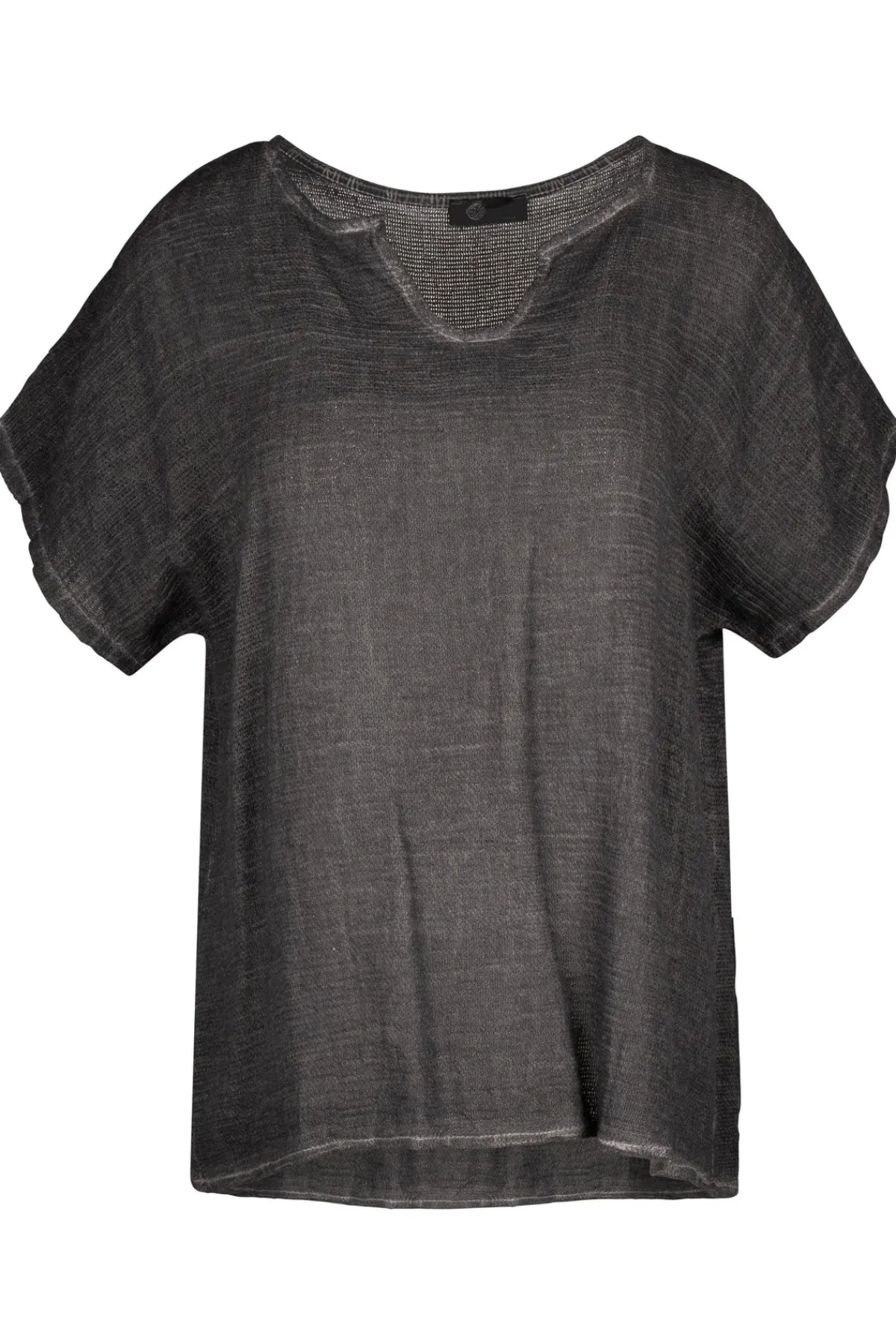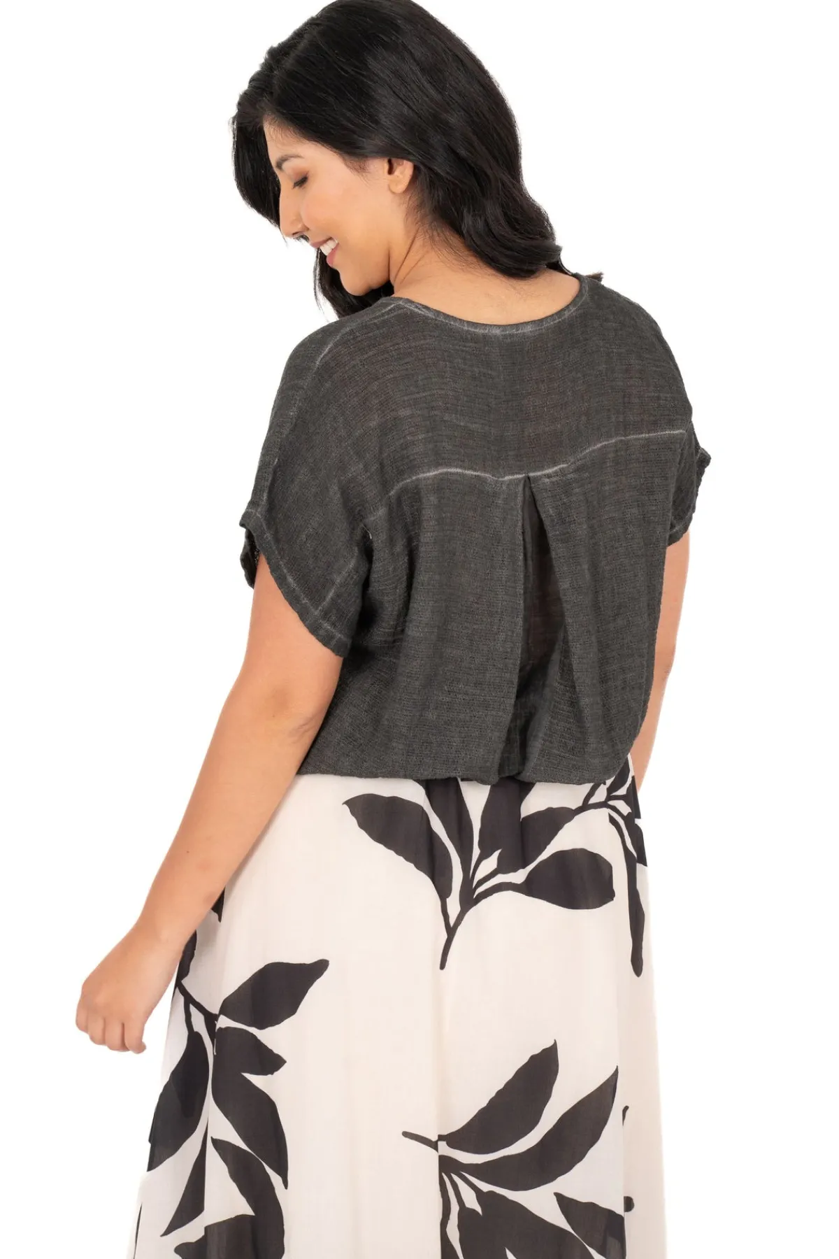 This playful V Neck Top blends linen and cotton into a waffle weave fabric that feels cool and flowy—perfect for summer days. Garment dyed in a washed-out black, it offers a relaxed vibe with a round neck featuring a cheeky V opening for a touch of flair. Comfortable and effortlessly stylish, it’s your go-to top for breezy adventures.