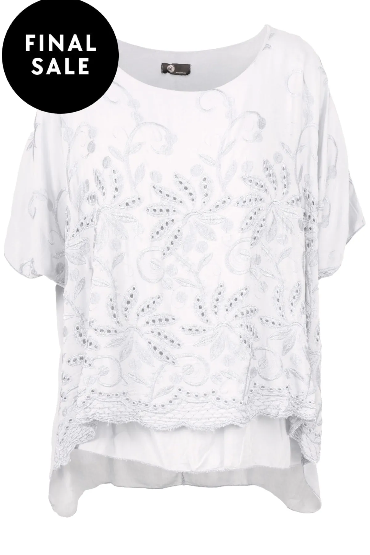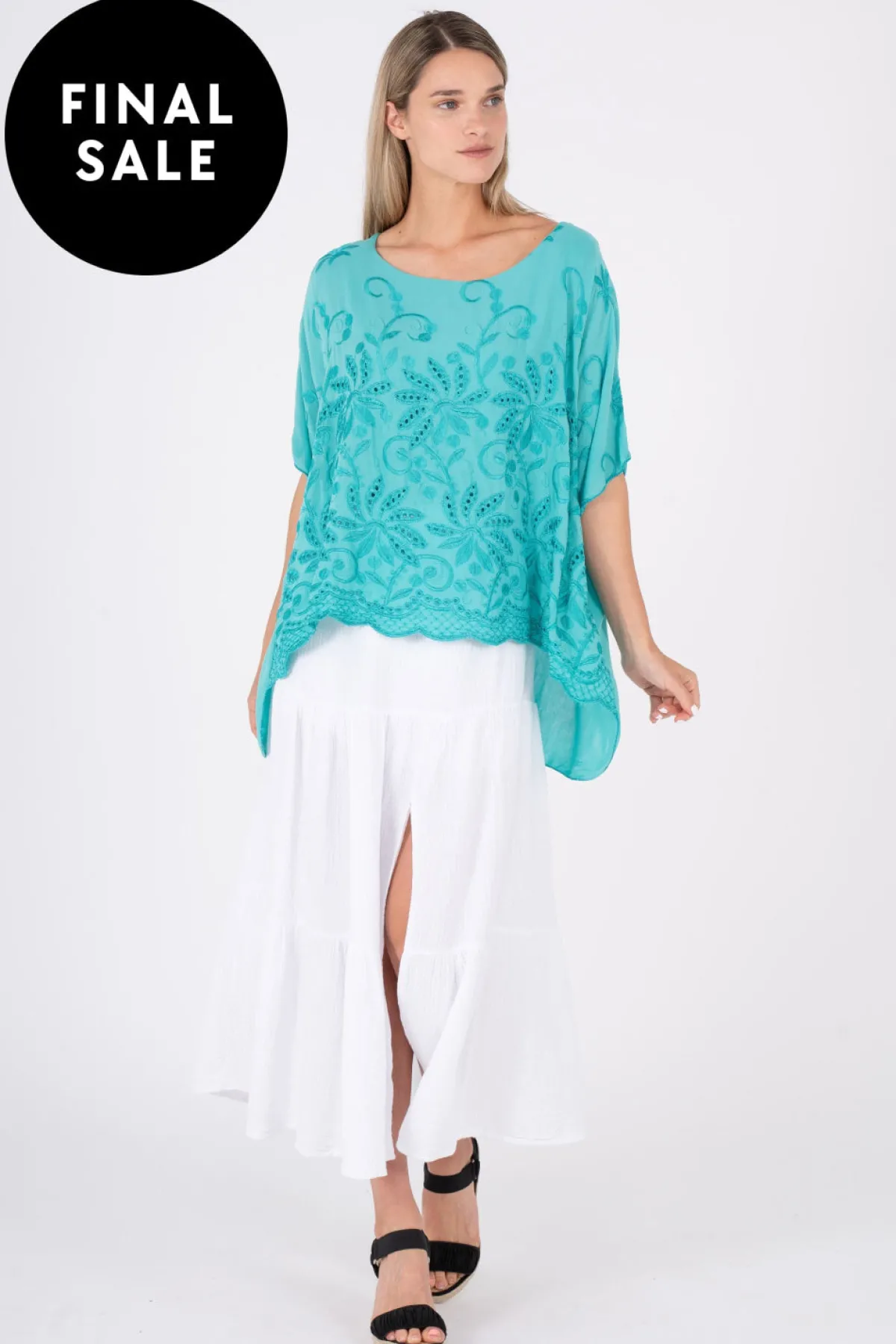 The perfect summer top, available in two stunning colours- lagoon and white. Its lightweight fabric and tonal embroidery add a touch of elegance to any outfit. Dress it up or down for any occasion. Experience luxury with this exclusive top.