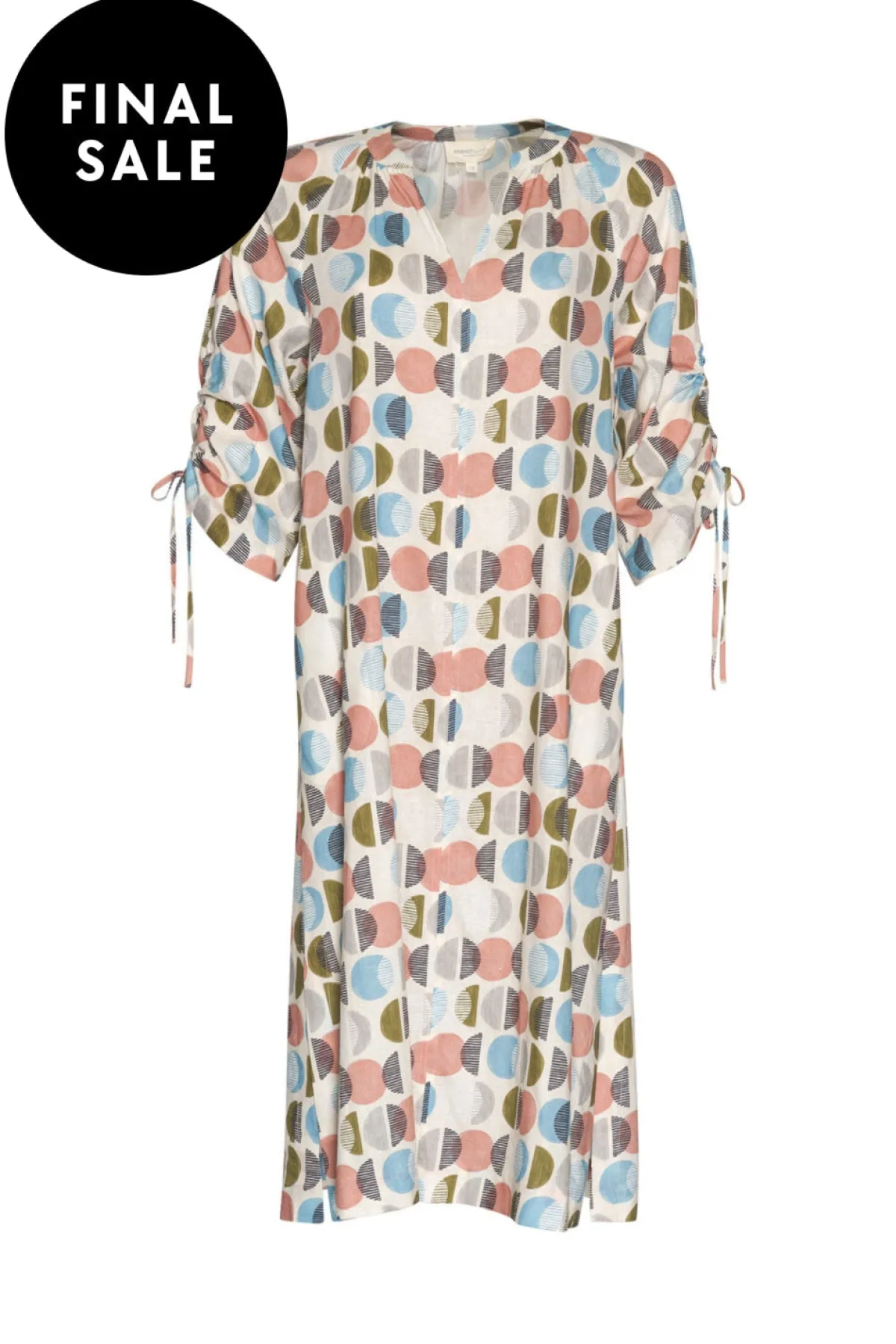 A-line midi dress with a V-neckline and 3/4 sleeves that can be ruched and tied, with stitched down side pockets and side splits.