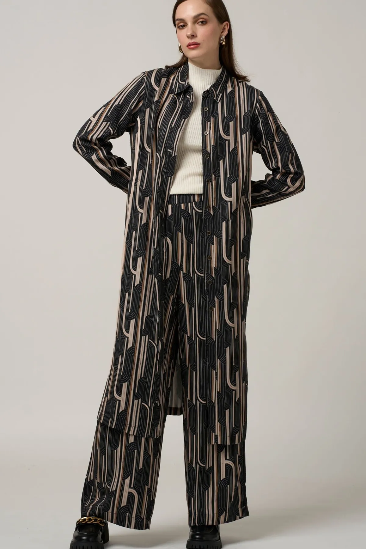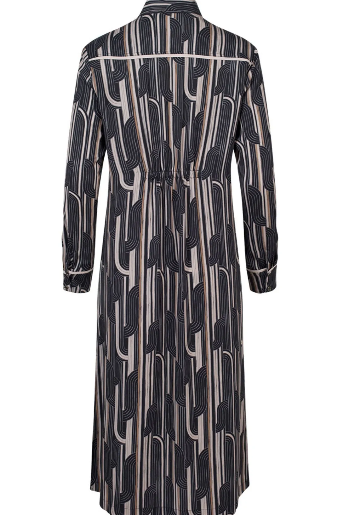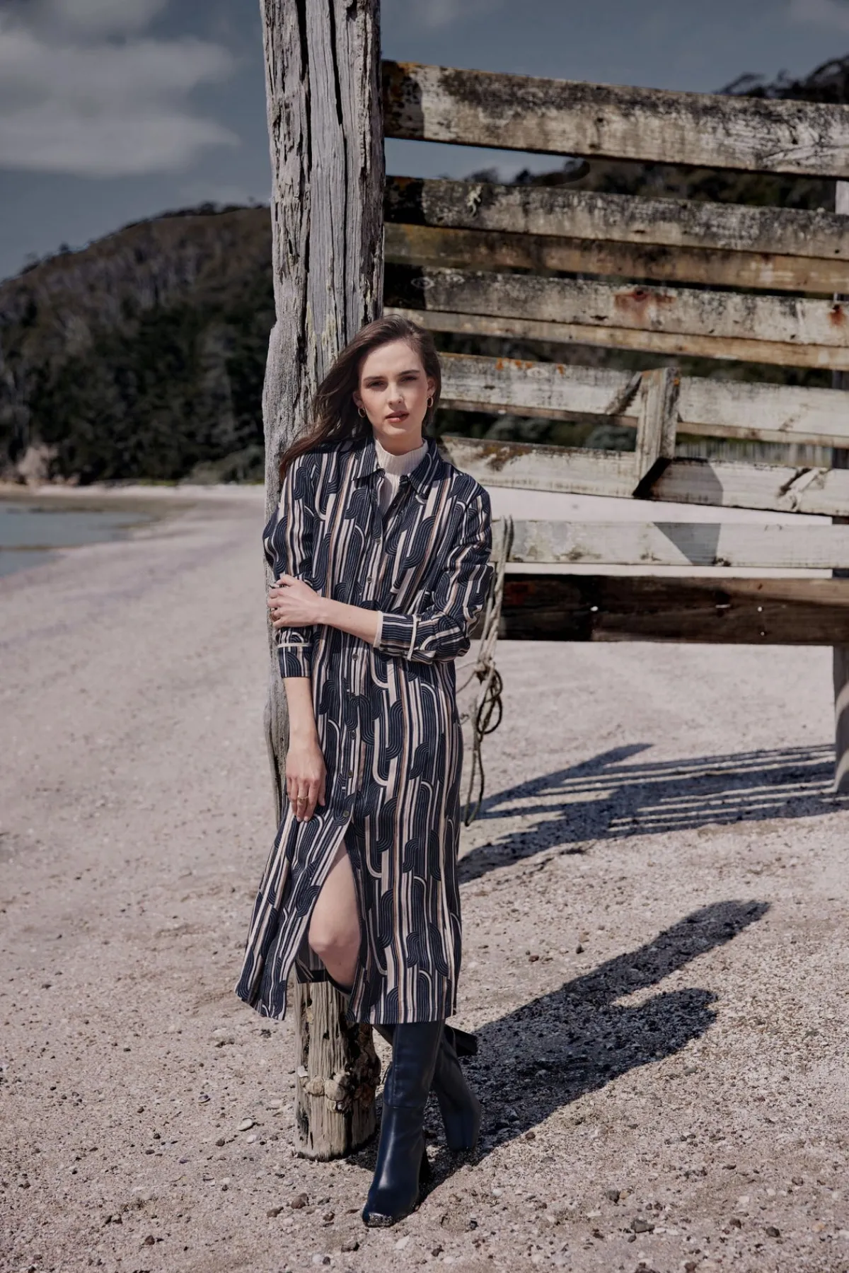 Striking winter dress that can be worn open over a top and pant as well! Button-through collared shirt dress with side splits and back waist elastic for shaping. Featuring contrast binding detail on cuffs, back yoke and side seams.