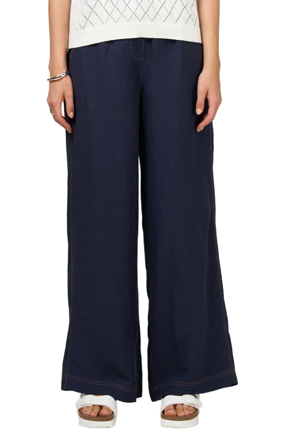- Wide leg pant in a linen blend with back pockets and an elasticated back waist, featuring contrast twin needle detailing to elevate the styling.