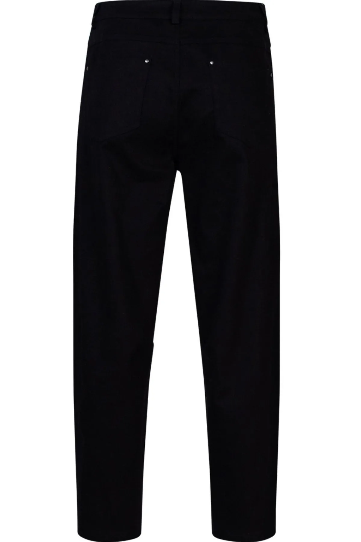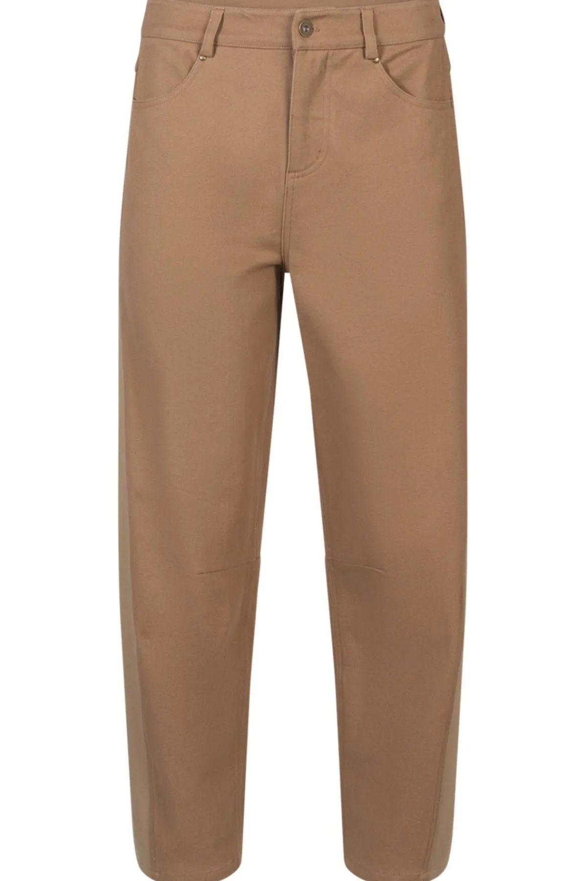 Relaxed cotton pant with front and back pockets, featuring angled ponte contrast panels.