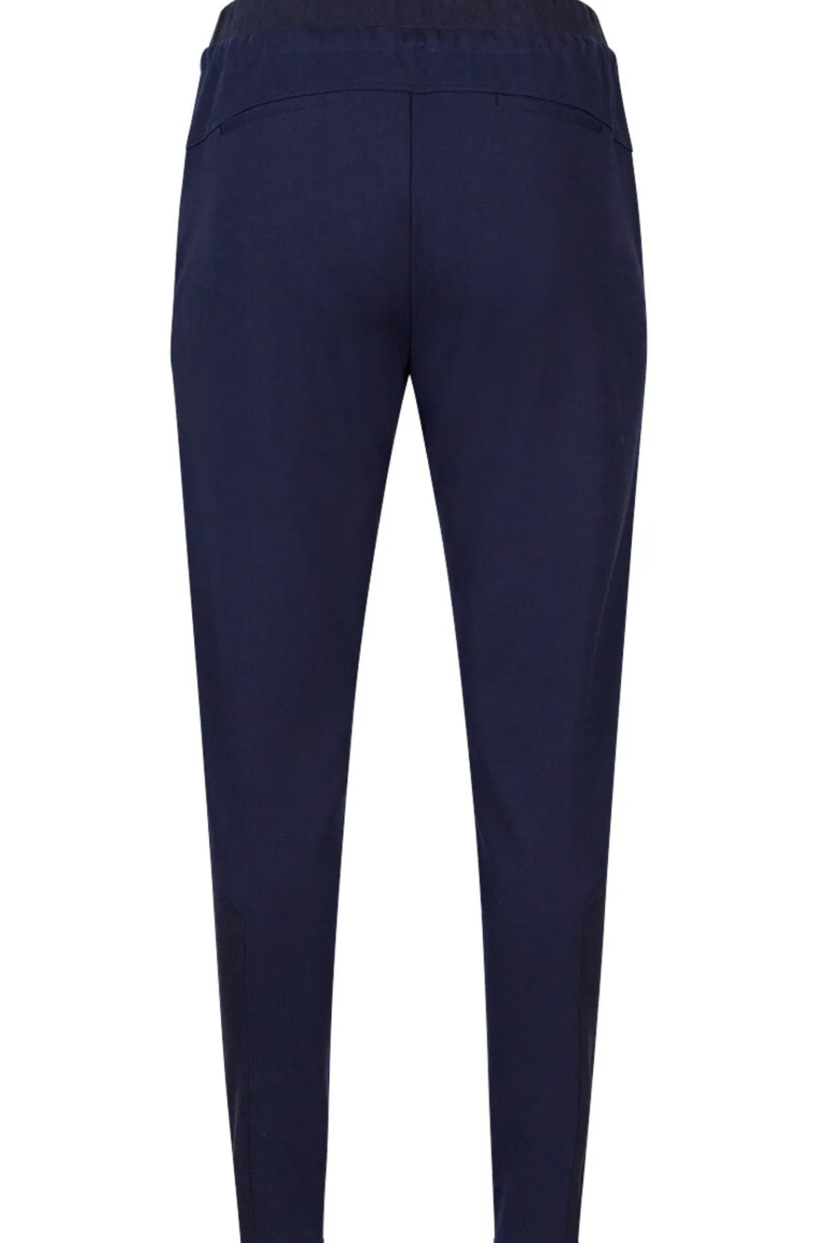 Slim fit ponte pant with a ribbed drawstring waistband, and ribbing panels at lower leg. Featuring geometric front pockets with metal studs.