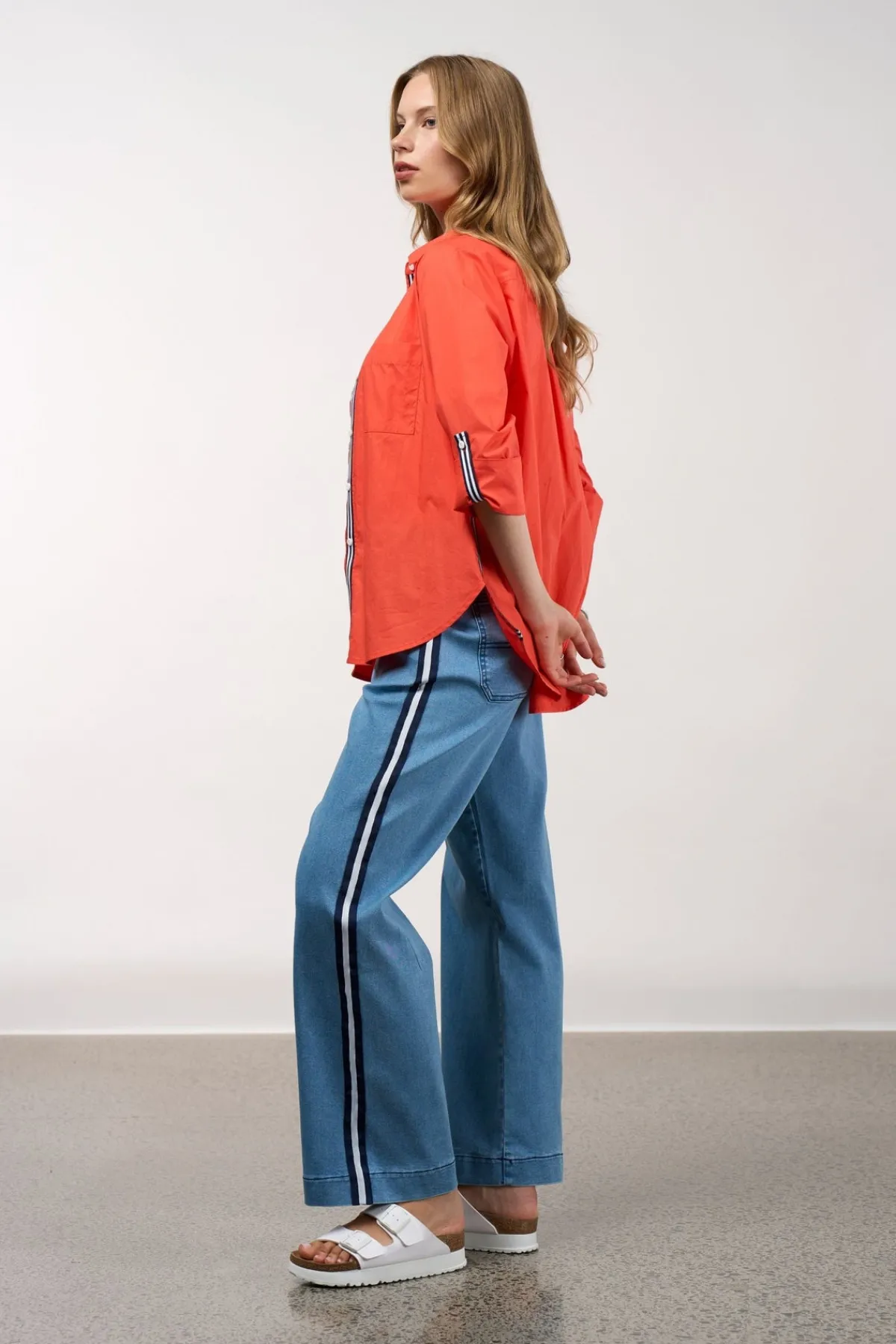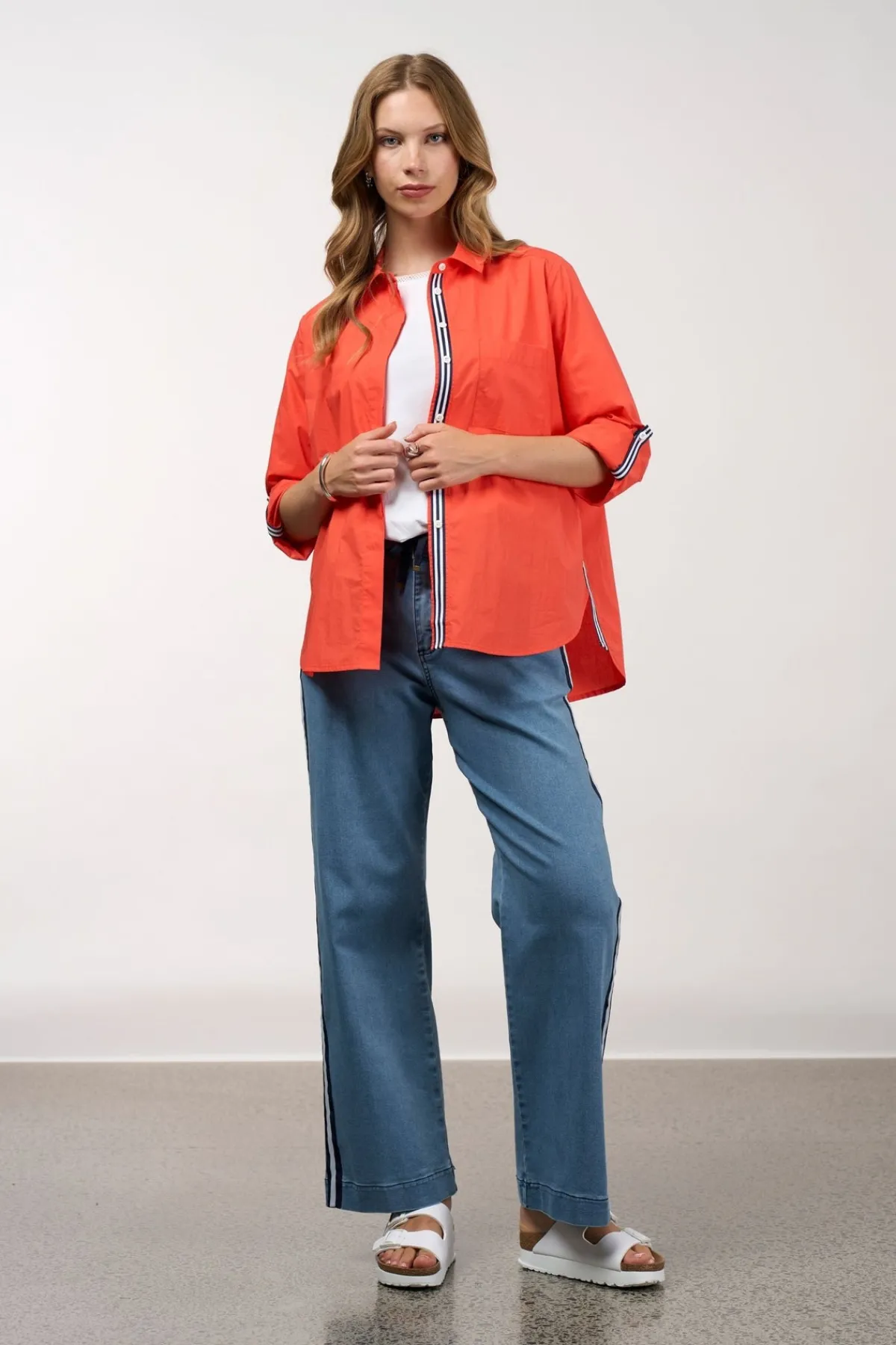 - Button-through cotton poplin shirt with stripe tape detail at side seam, overarm tab, centre back yoke and under the front placket, to be revealed when buttons are undone.