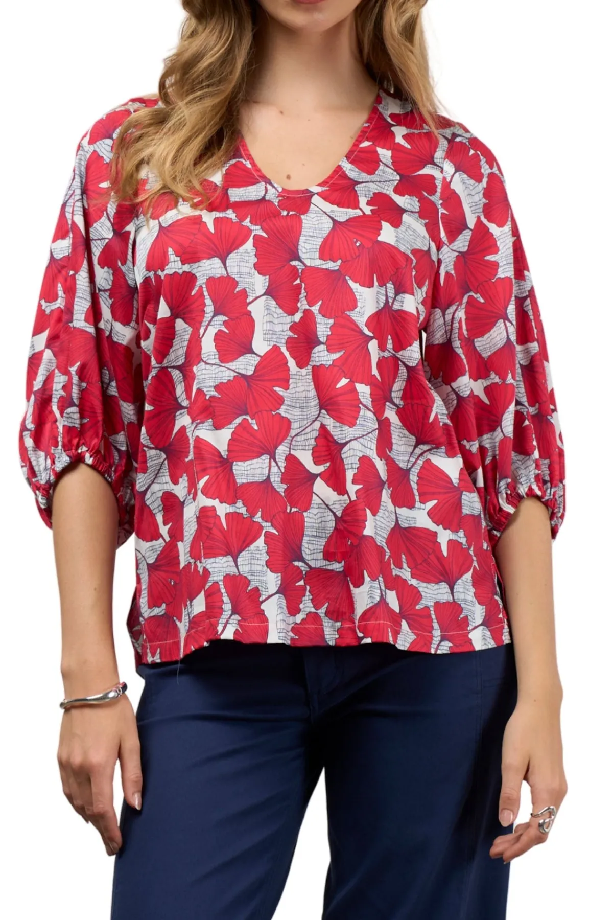 - A printed top with a rounded V neckline, featuring 3/4 length blouson sleeves gathered into an elasticated cuff and side splits for ease of fit.