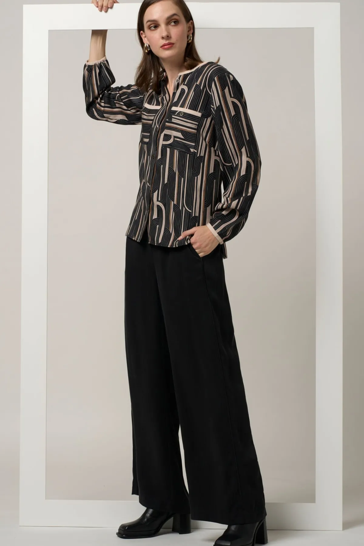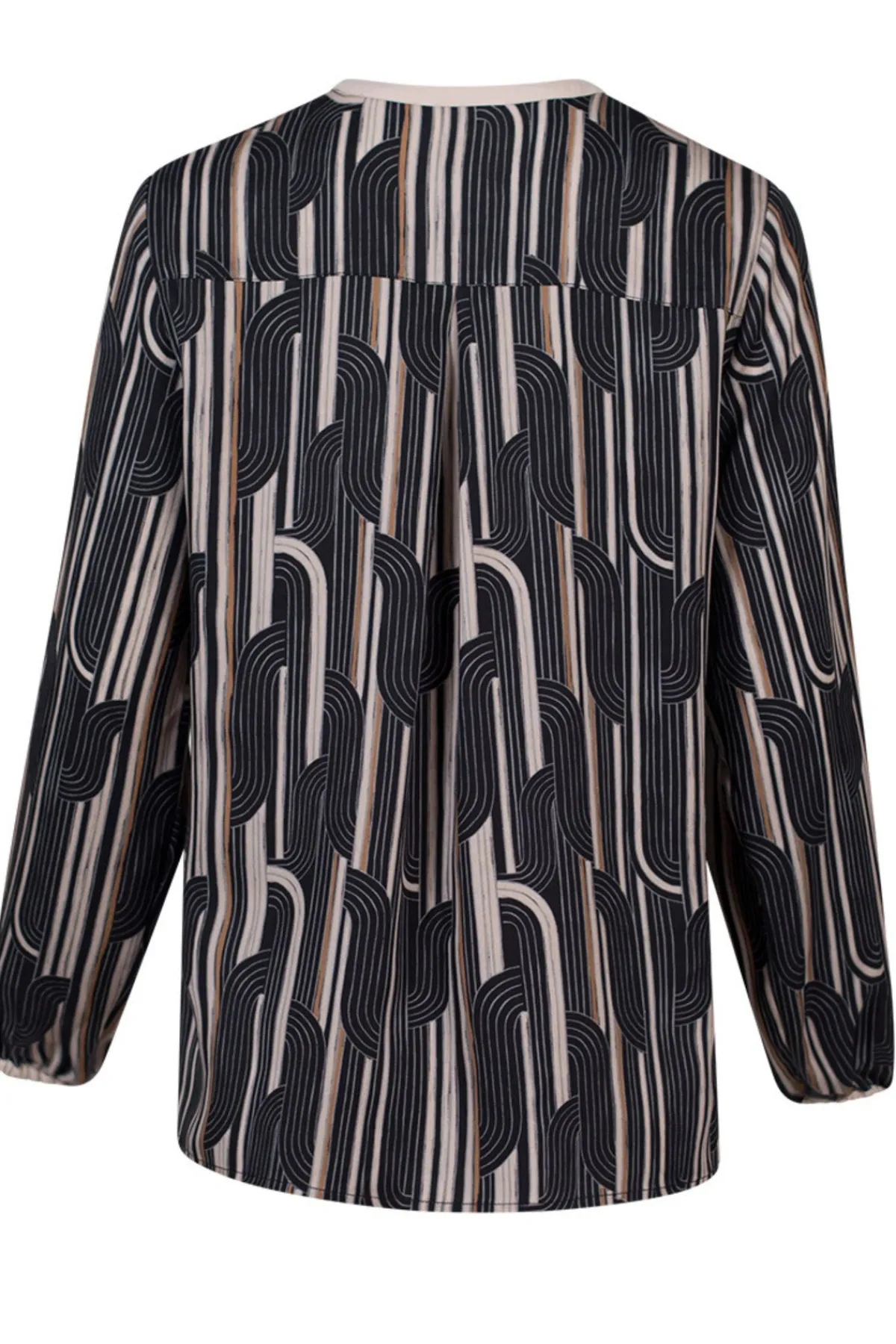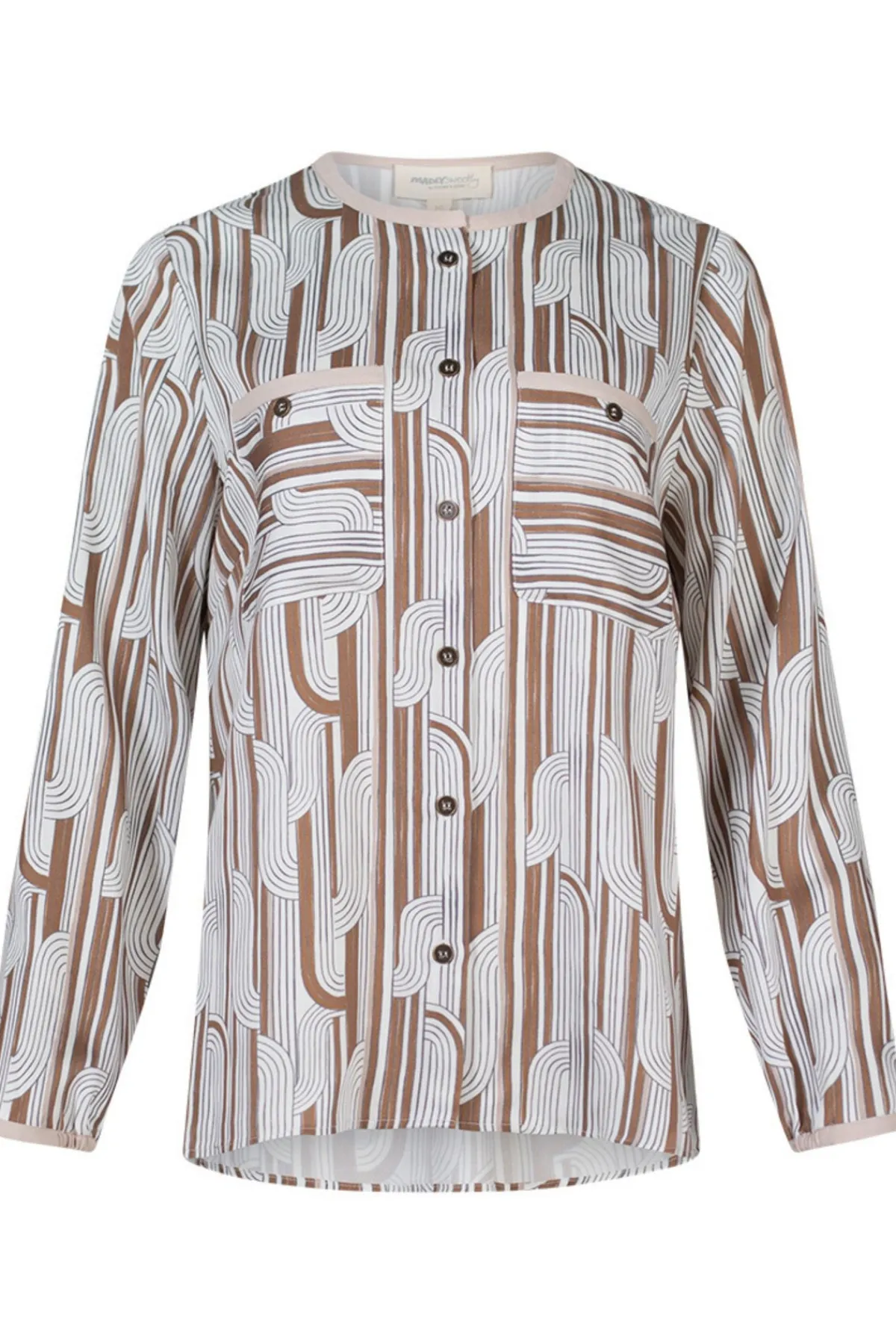 Stunning geometric print new from Madly Sweetly. Button-through top with metal buttons and pockets. Featuring contrast binding on neckline, pockets and cuffs.