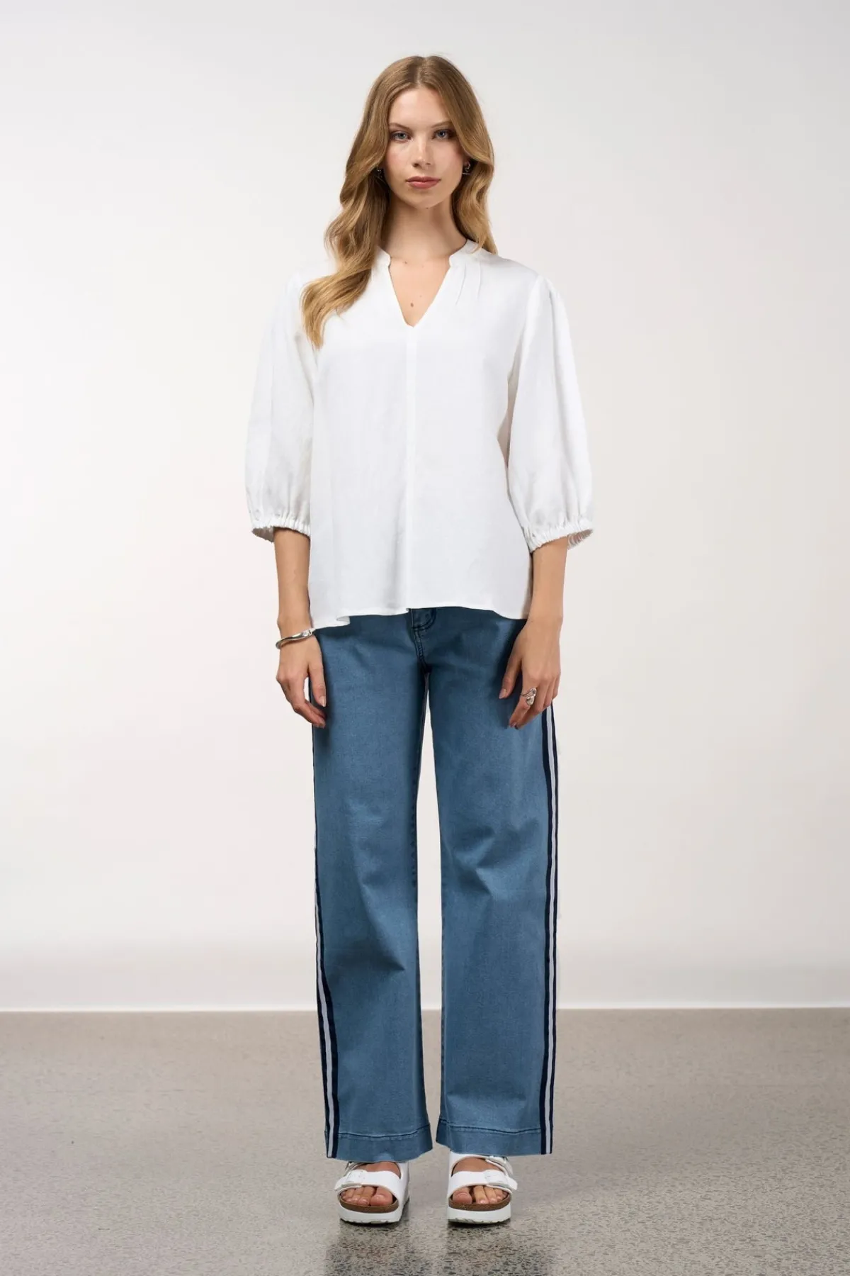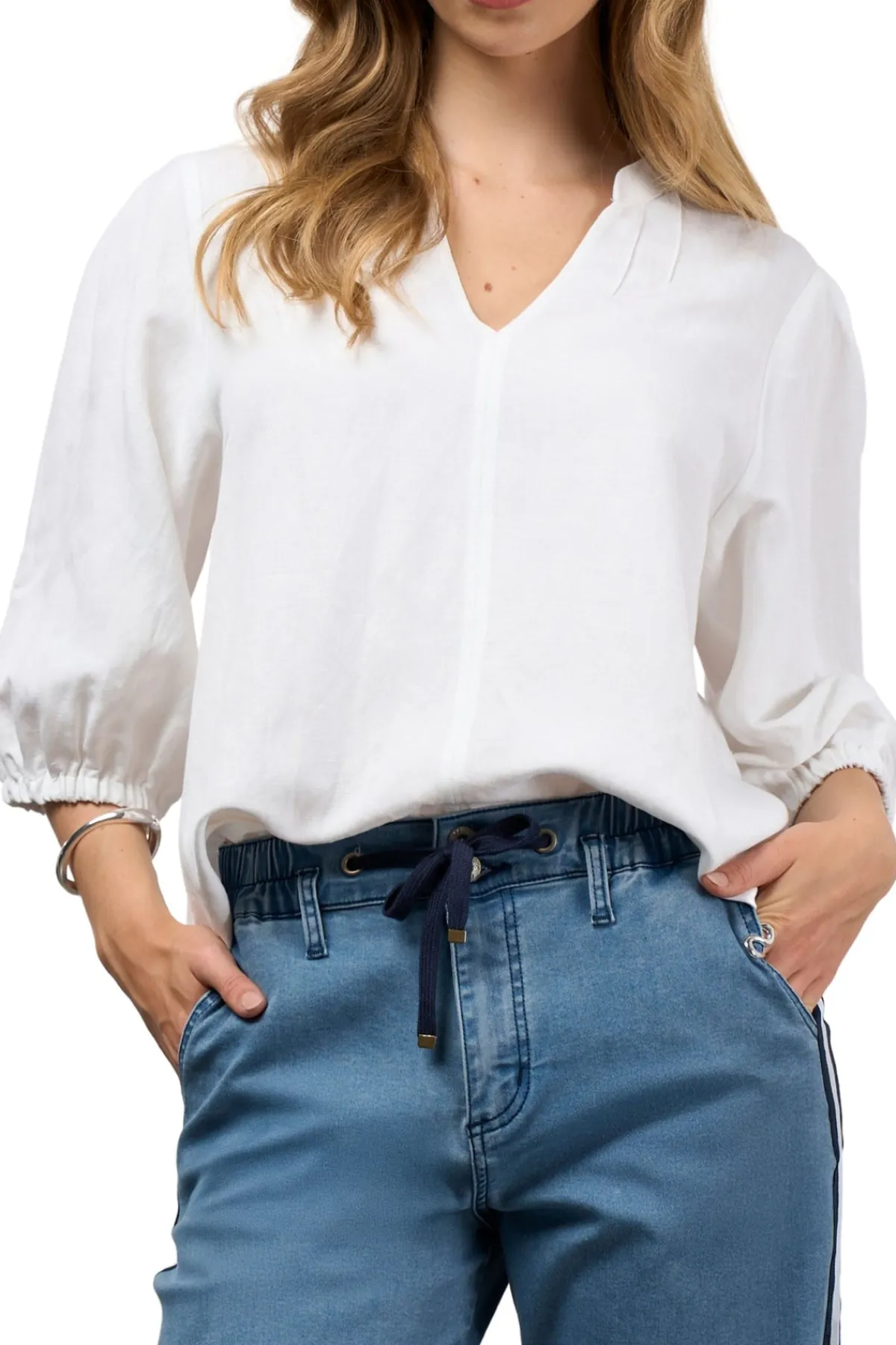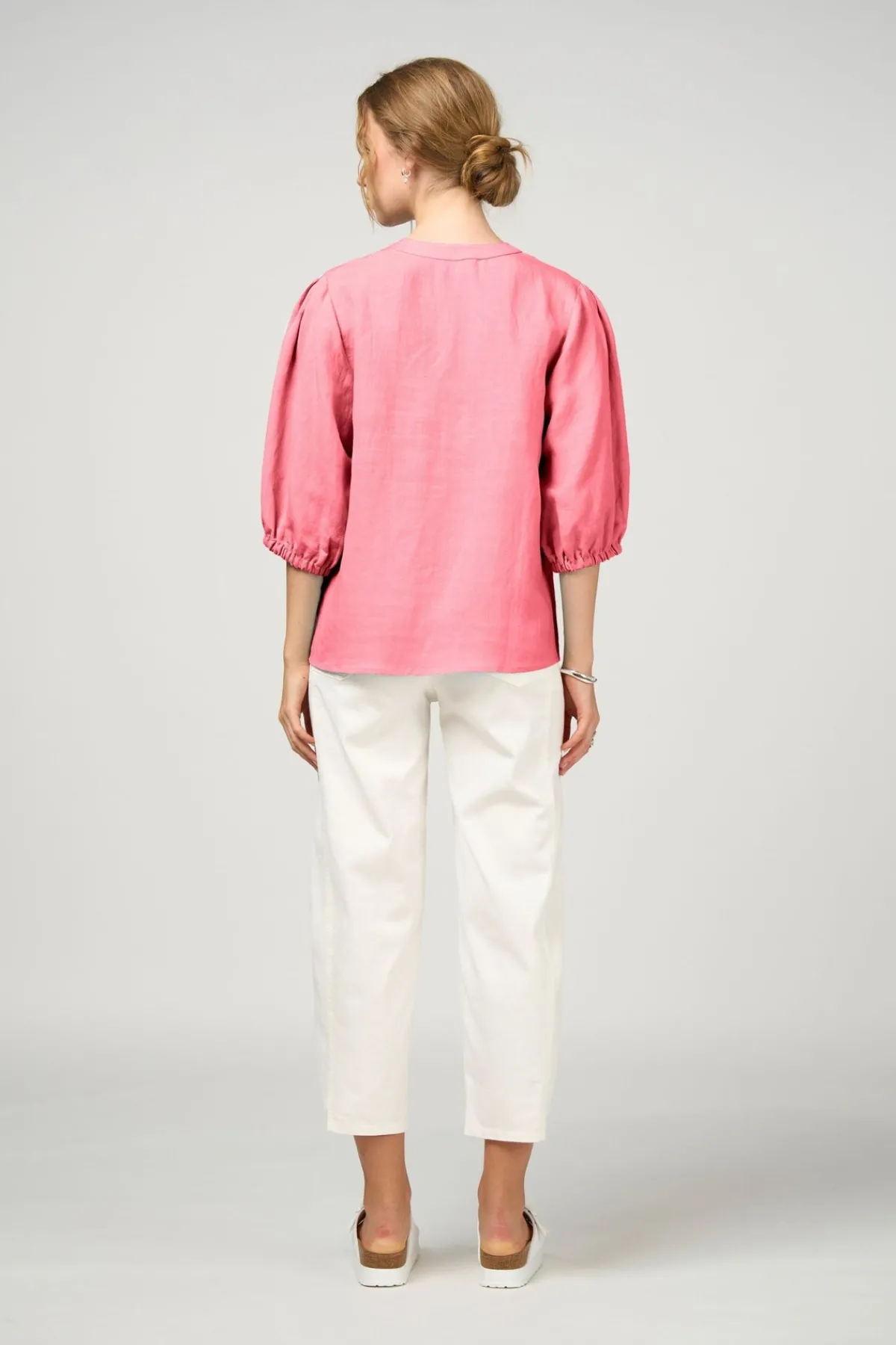 Relaxed fitting top with a V neckline, featuring fine pin-tuck detailing at the front neck and at the shoulder, with blouson sleeves and elasticated cuffs.
