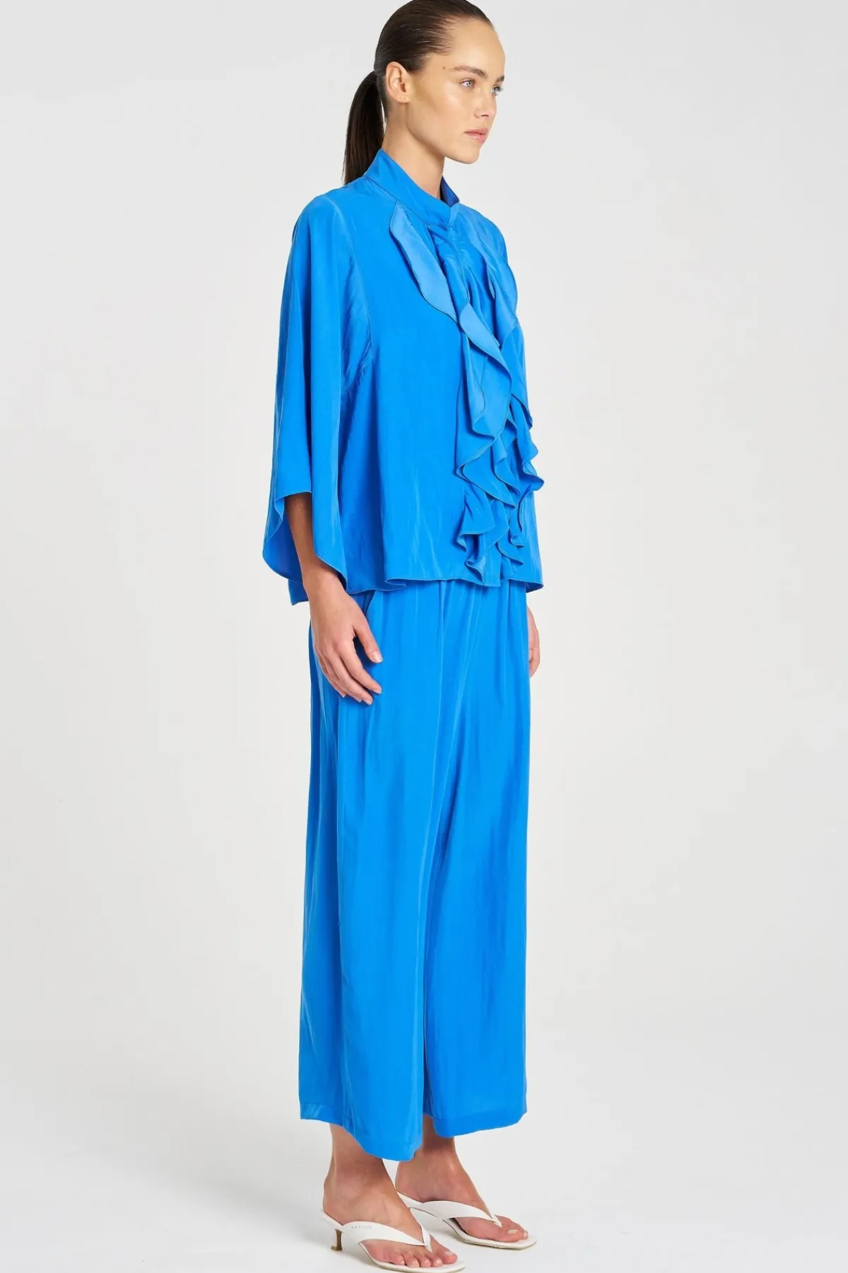 Crafted in Mela Purdie’s classic matte finish Powder Knit. The Fezz Blouse is an elevated piece, featuring ruffled panels down the front, a wide sleeve and stand collar.