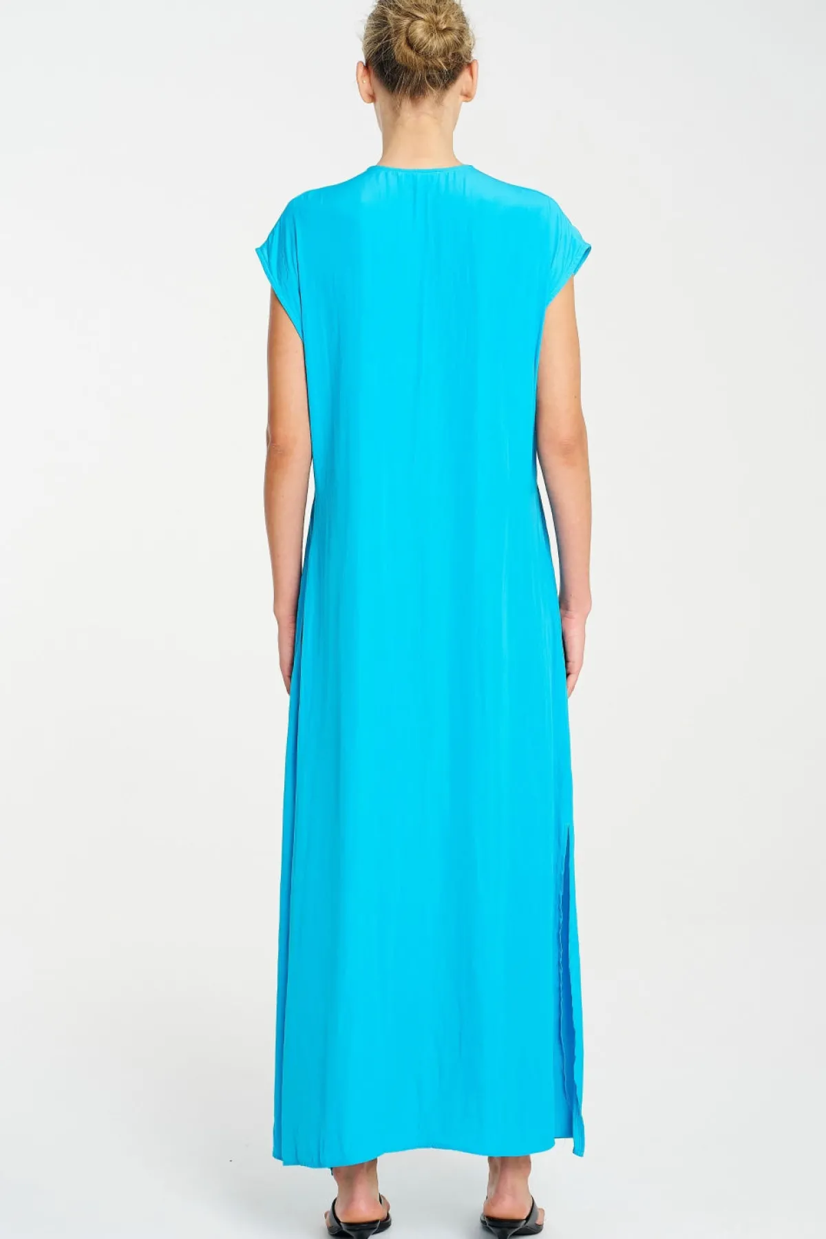 The Mela Purdie Maxi Slice Dress, crafted from Mache is a wardrobe essential. This Maxi length style features a v-neckline down front and side splits at hem for extra movement. This dress has endless styling possibilities.