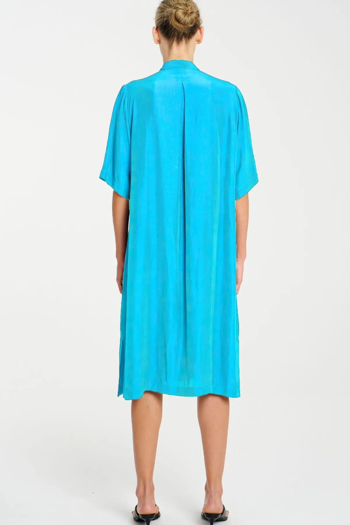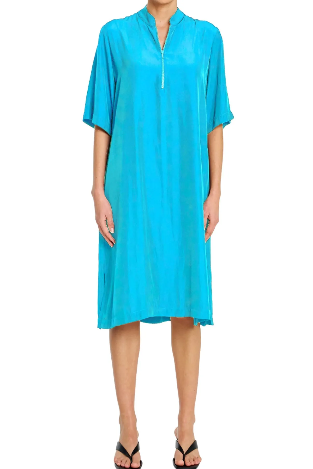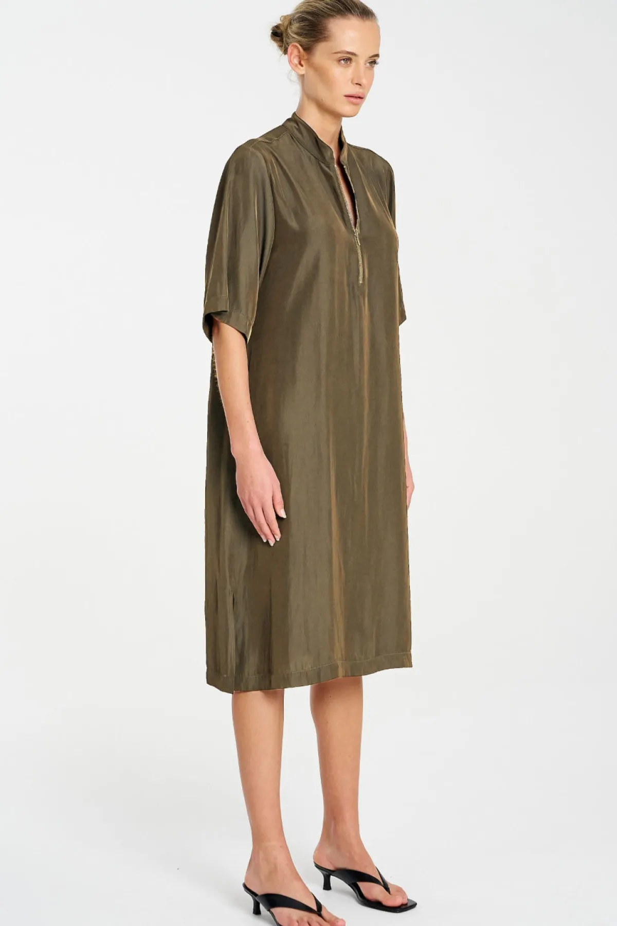 Crafted from Mela Purdie’s Mache, featuring a relaxed fluidity & smooth lustre surface. The Zip Plaza Dress featuring a half front zip and crisp stand collar in a mid length this is an easy to wear staple for your capsule wardrobe.