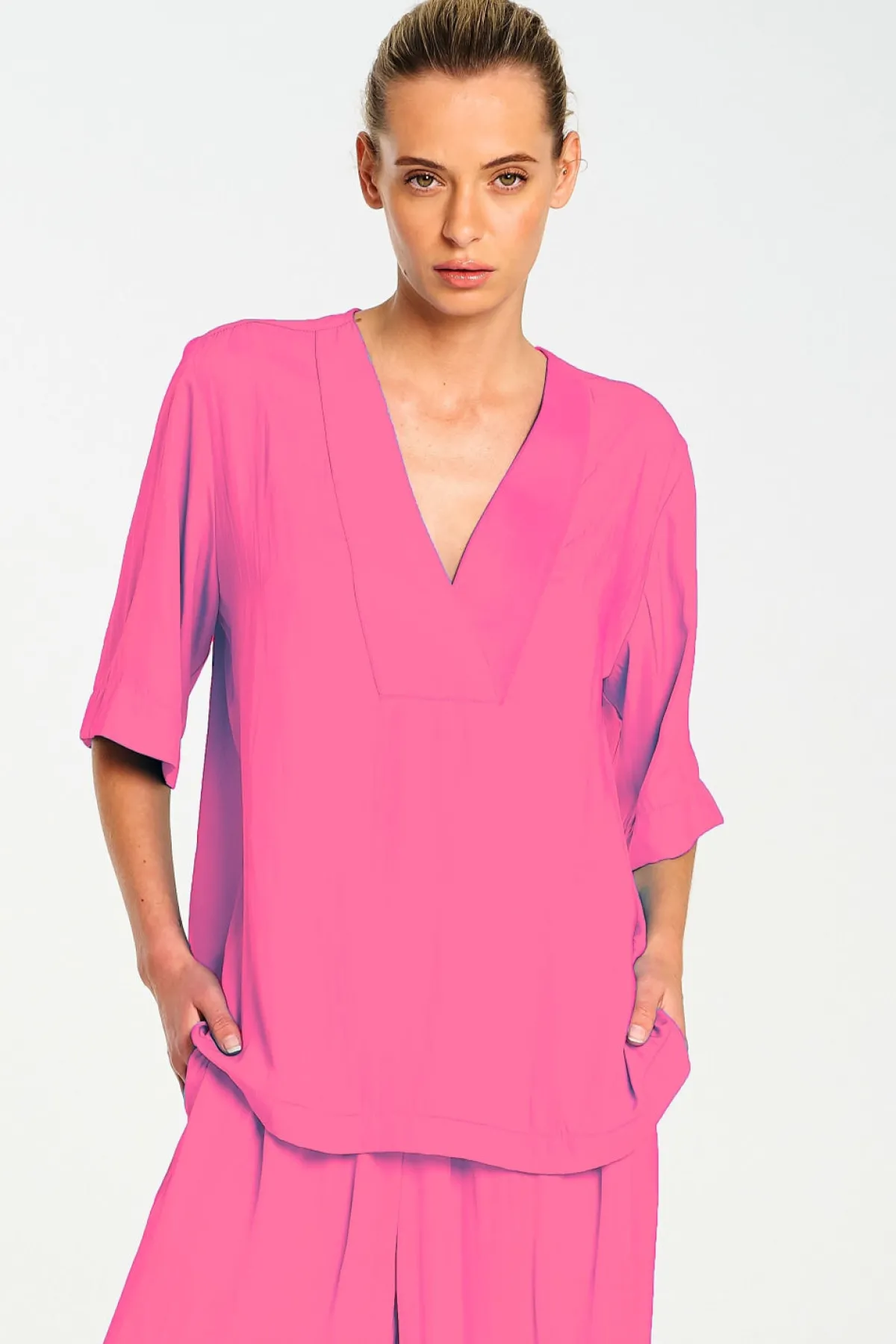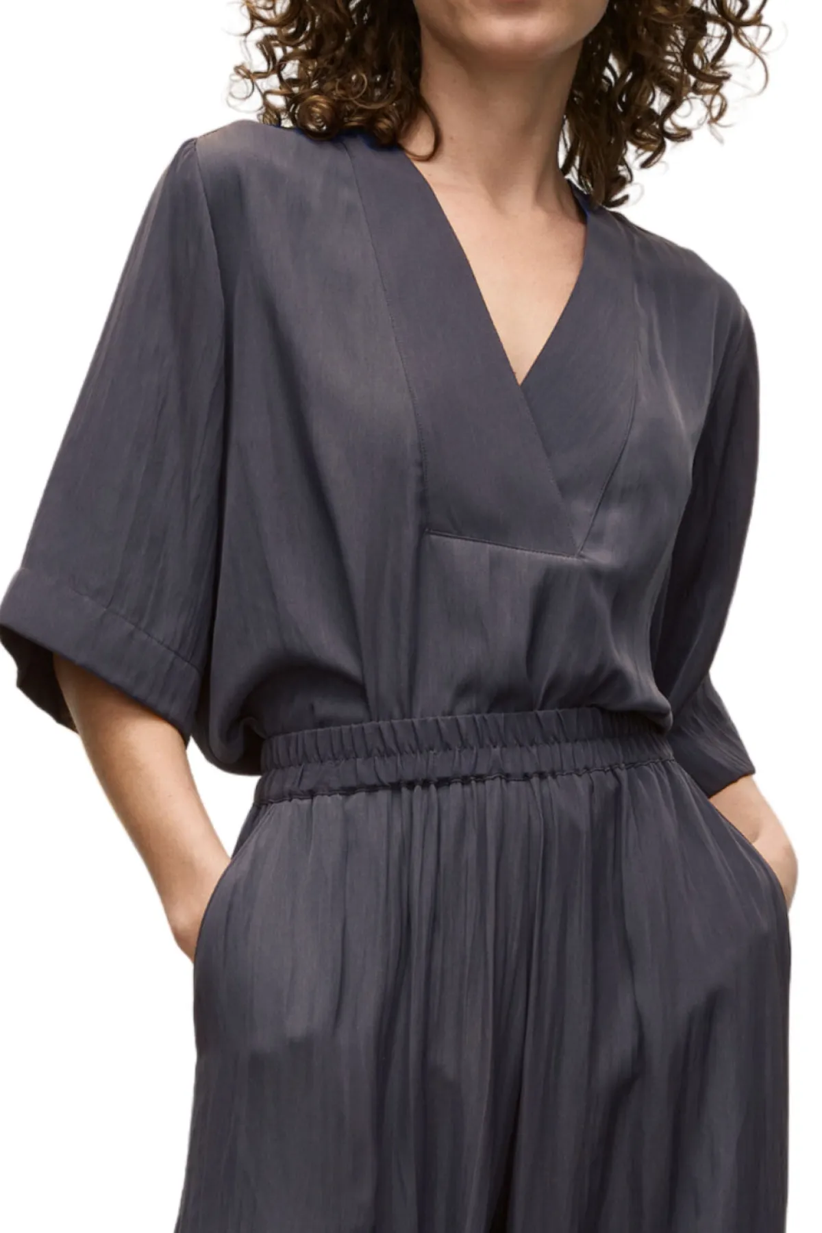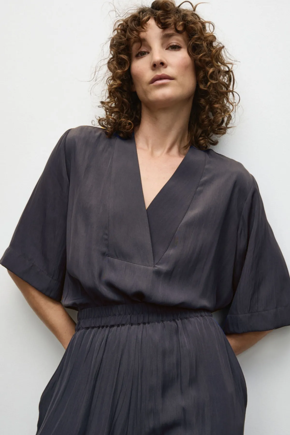 Crafted from Mela Purdie’sMache, featuring relaxed fluidity & a smooth lustre surface. TheVent Plazafeatures V Neck cross over neck detailing on a boxy silhouette.