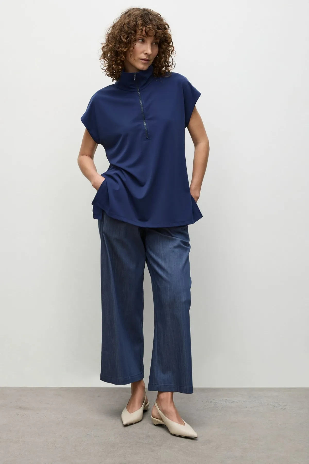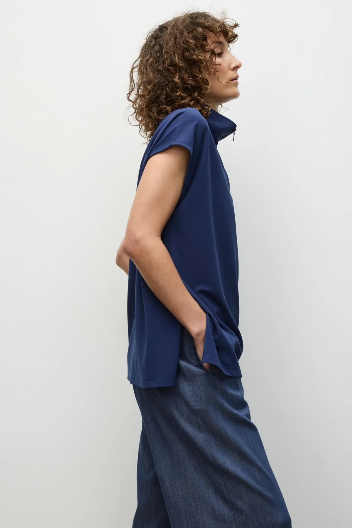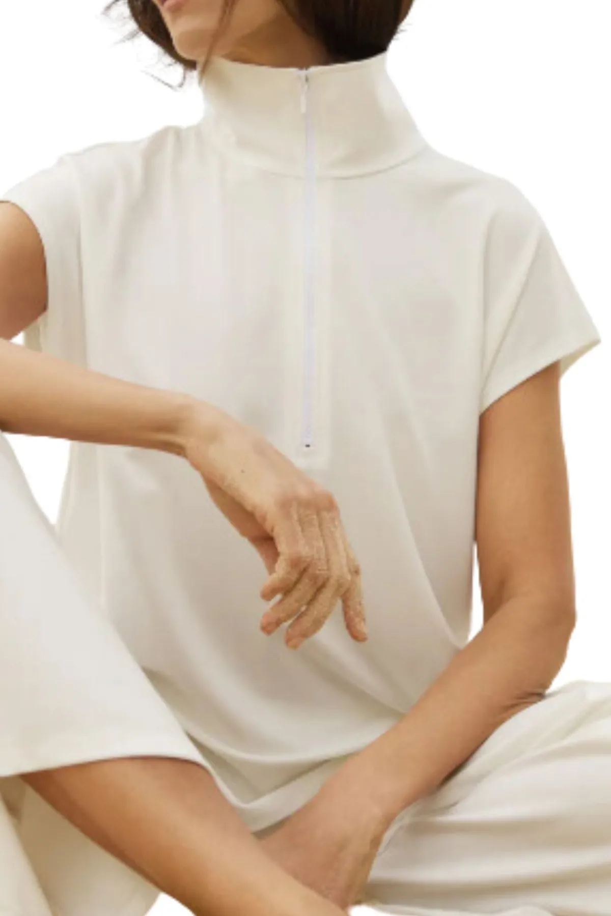 Crafted from Mela Purdie’s compressed Matte Finish Powder Knit, The Zip Front Shell features half zip detailing through front with a firm stand collar.