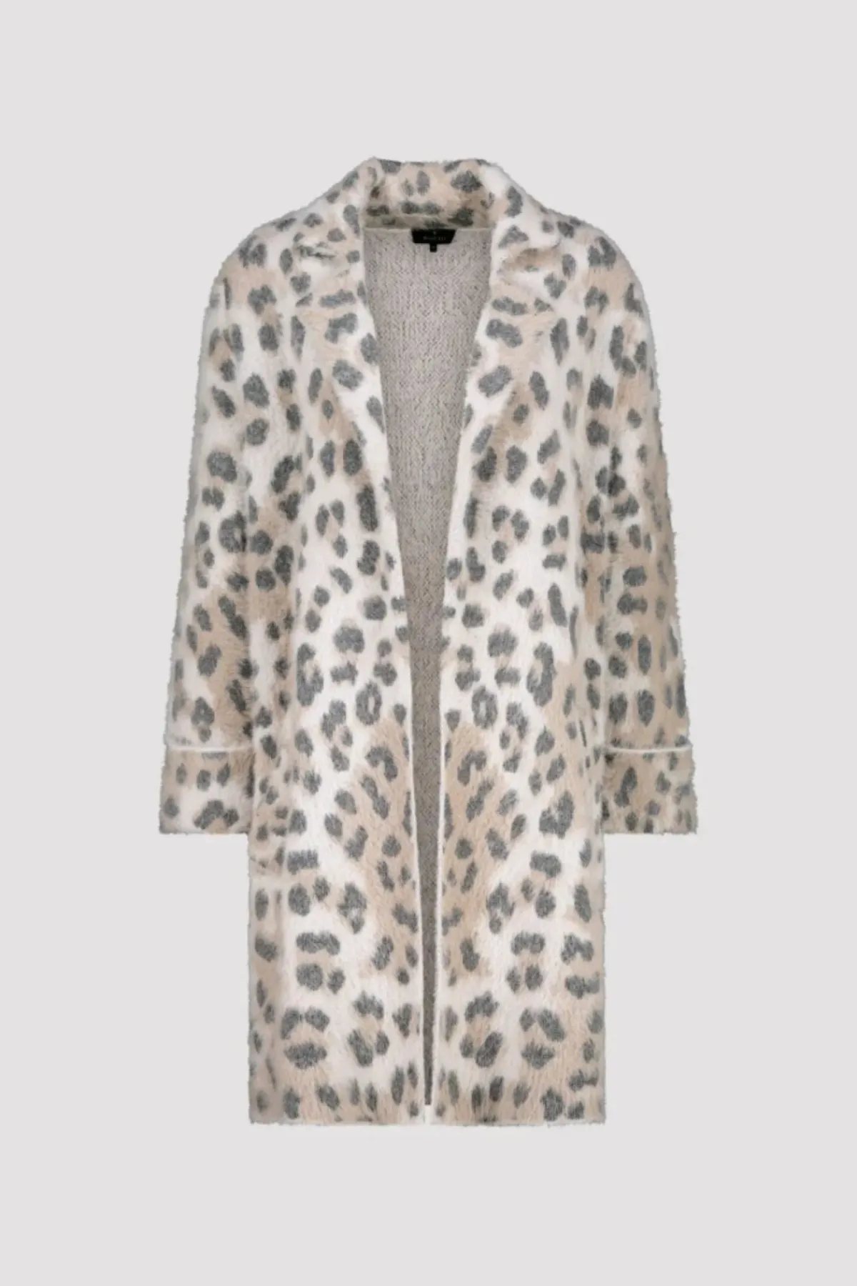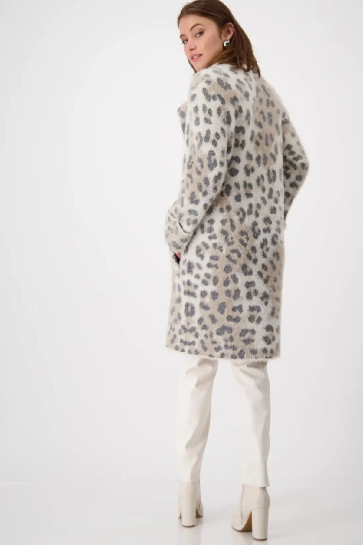 A longline coatigan with a animal print pattern and soft feel fabric. The fleecy, plush coat impresses thanks to its all-over leopard pattern in jacquard fabric. It has no closure and features practical in-seam side pockets.