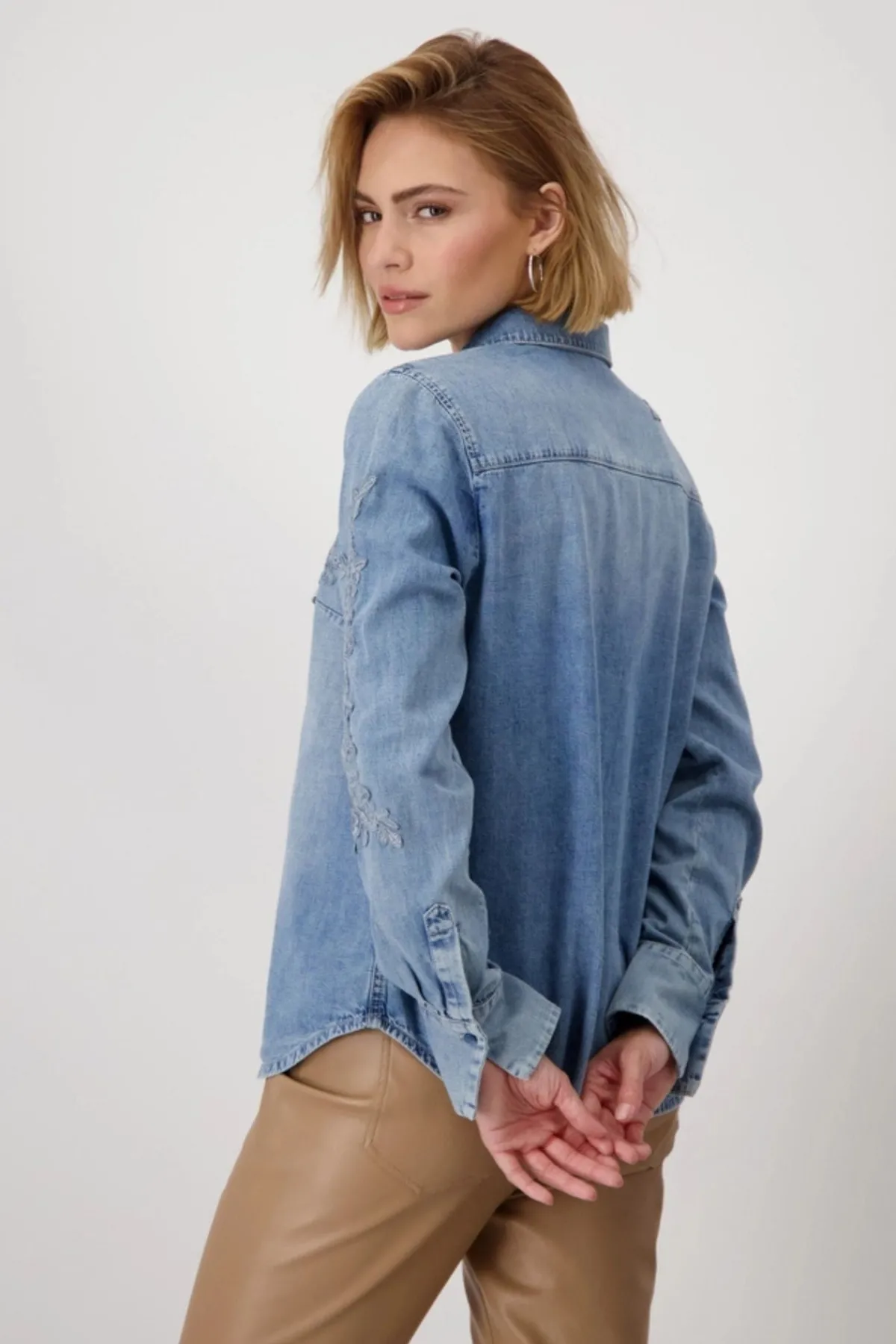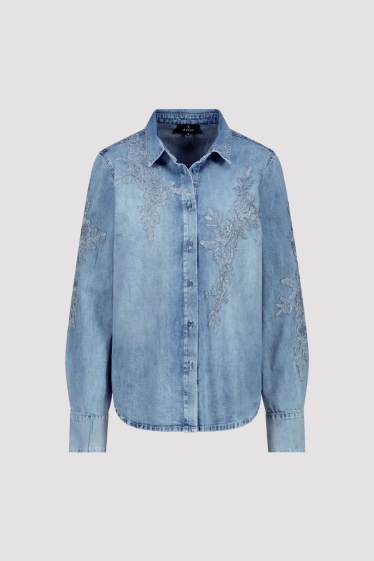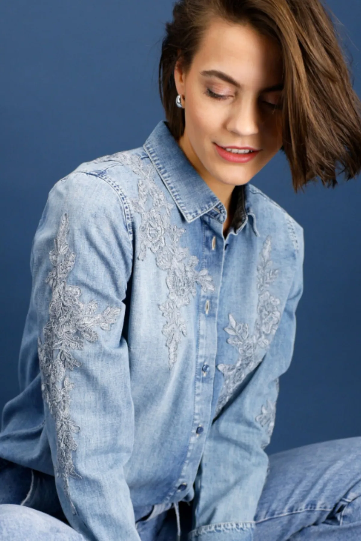 This 100% cotton denim shirt features unique lace appliqués. Featuring a shirt collar, long sleeves, and a button placket, it’s a timeless classic.