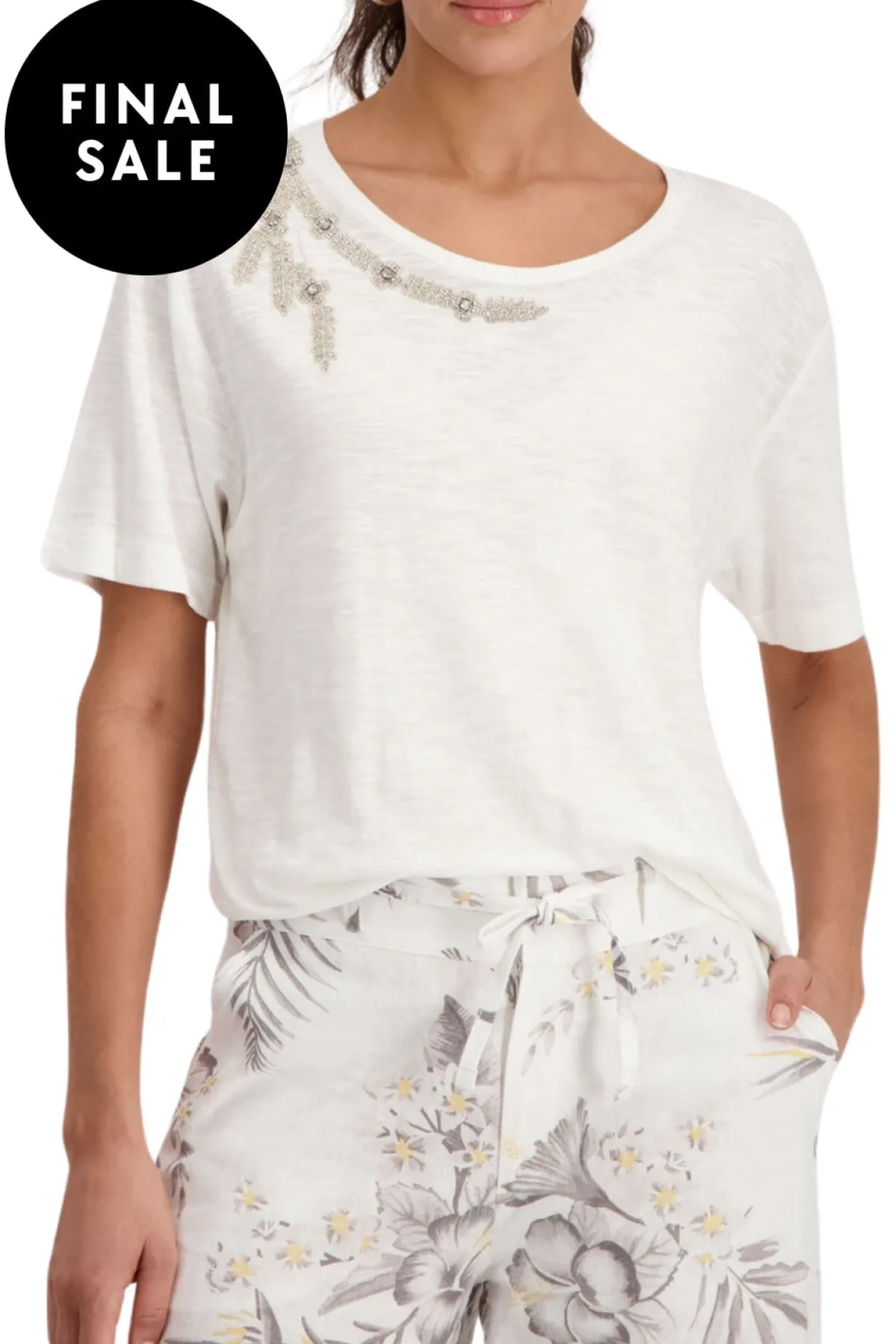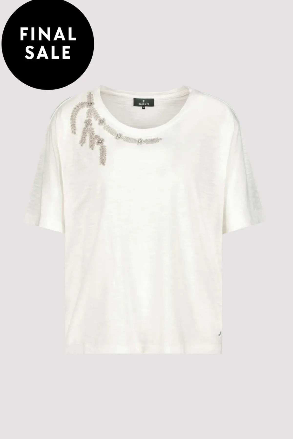 The T-shirt made of cotton and viscose impresses with its application of sparkling gemstones. A perfect party look!