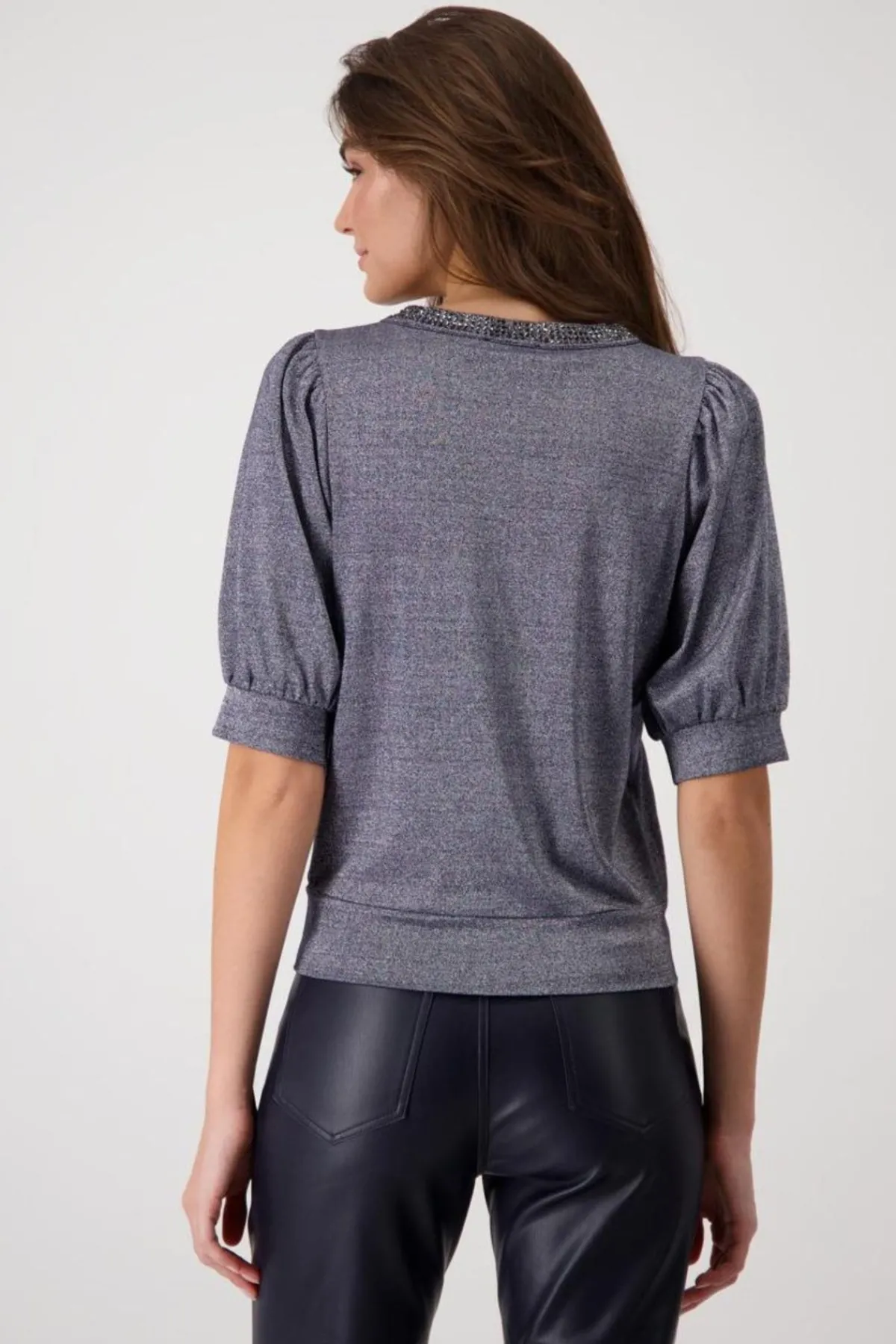 This high-quality garment features a round neckline and subtle metallic sheen for a modern touch. Simple yet timeless, the short sleeves provide an airy look. Perfect for any occasion, this elegant blouse fits seamlessly into the current versatile trend. Wear it with classic black trousers for a refined look, or dress it down with jeans for a more relaxed style. The metallic shade adds a touch of glamour to your fashion.
