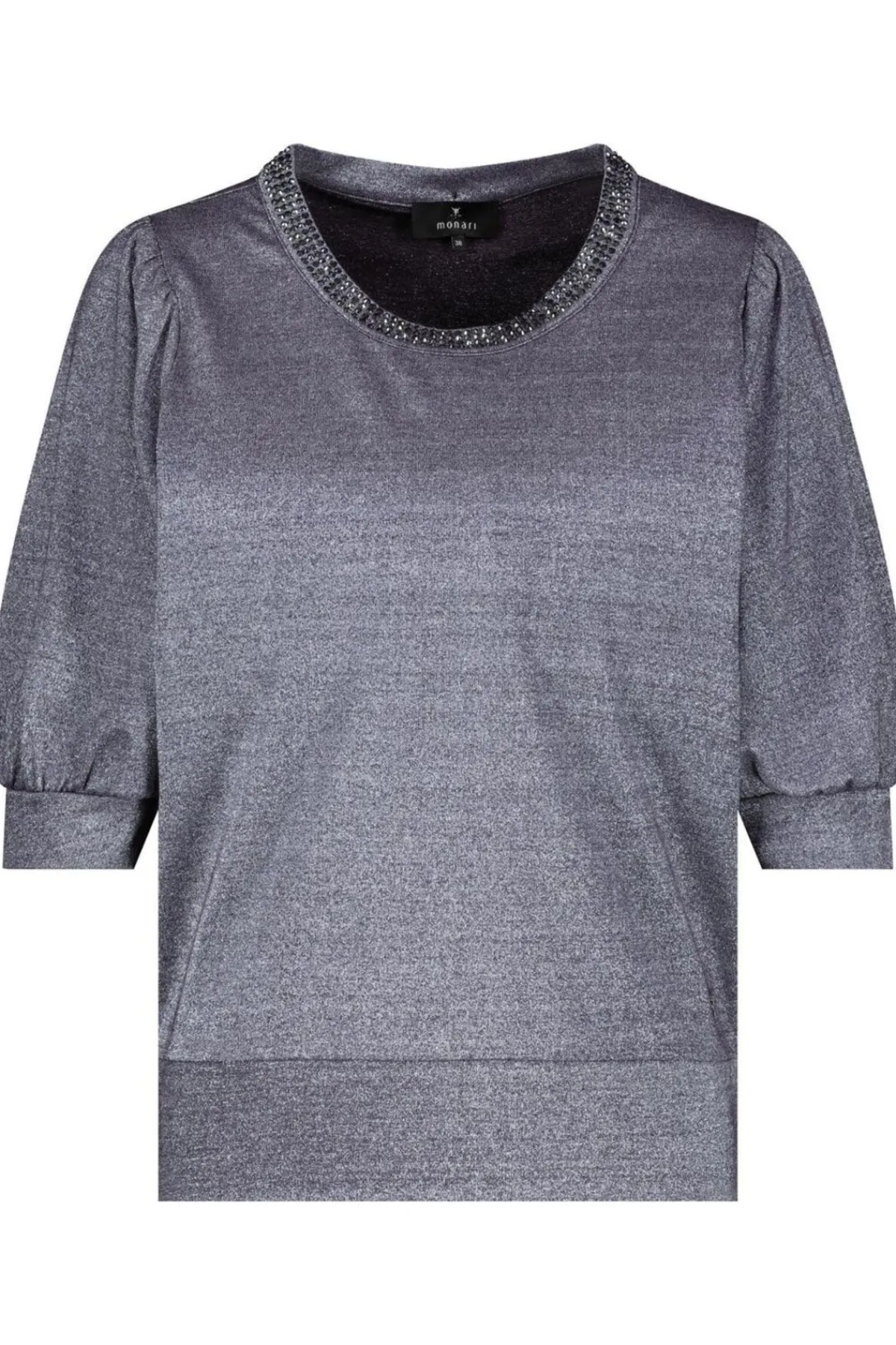 - Round neckline with rhinestone studs