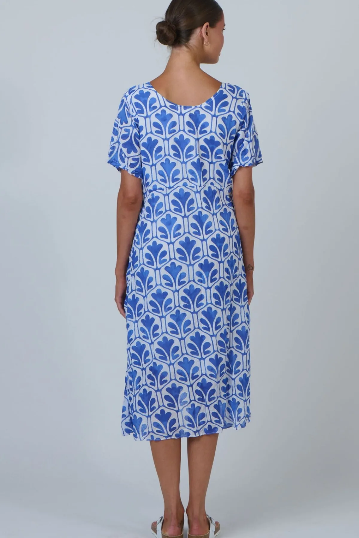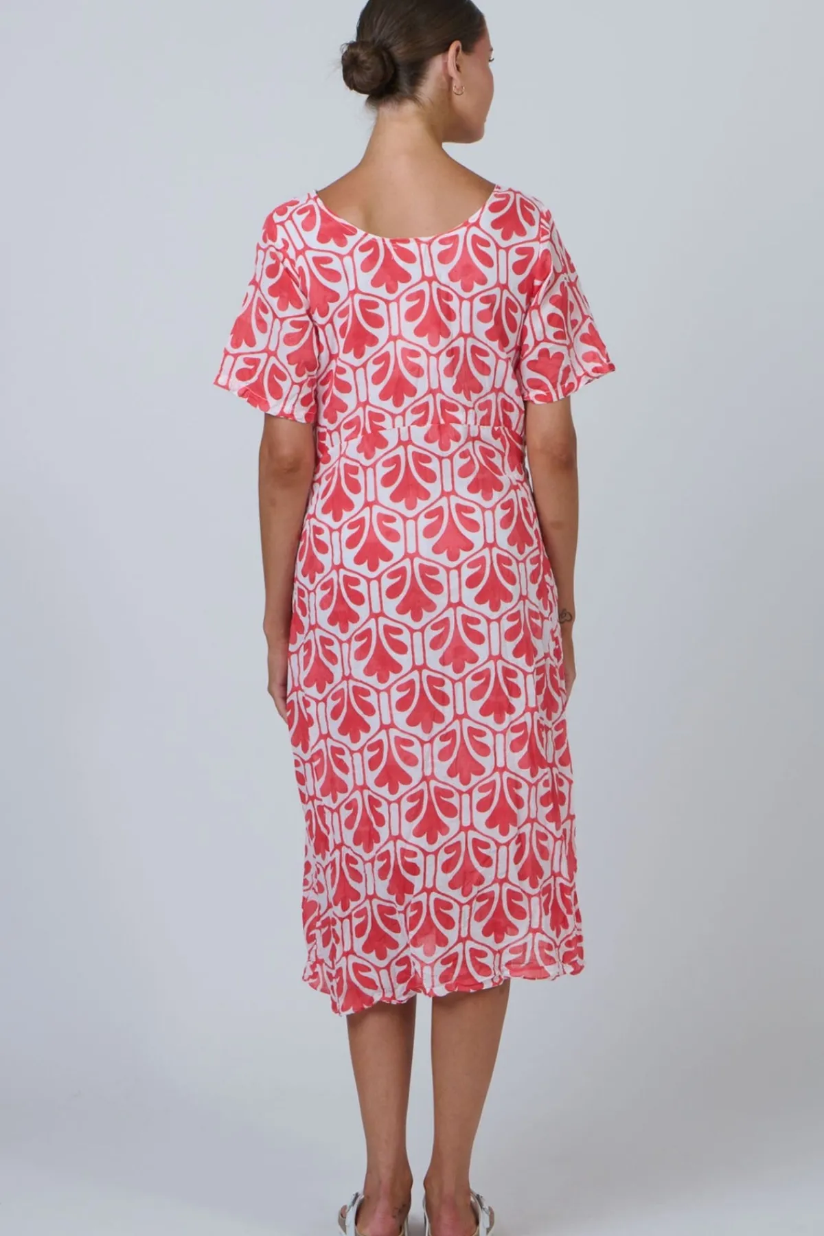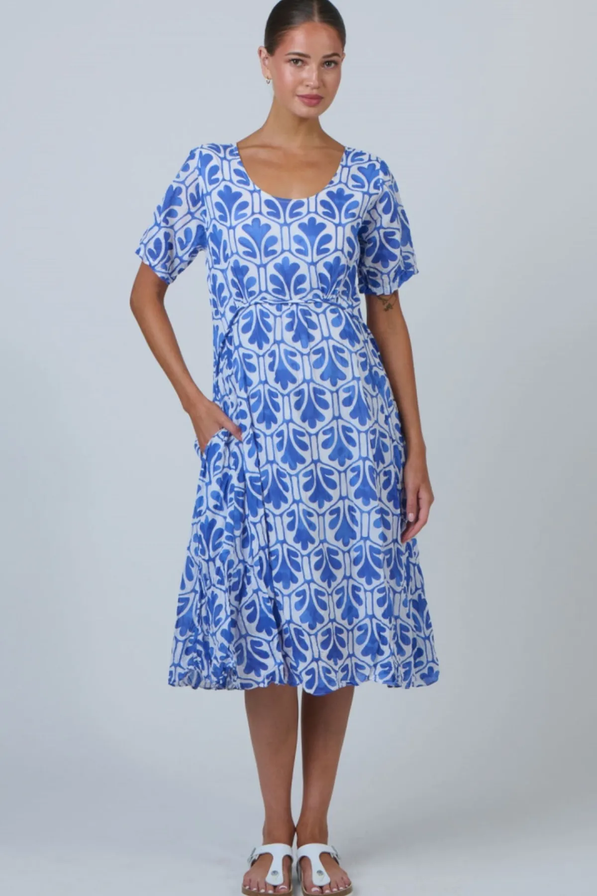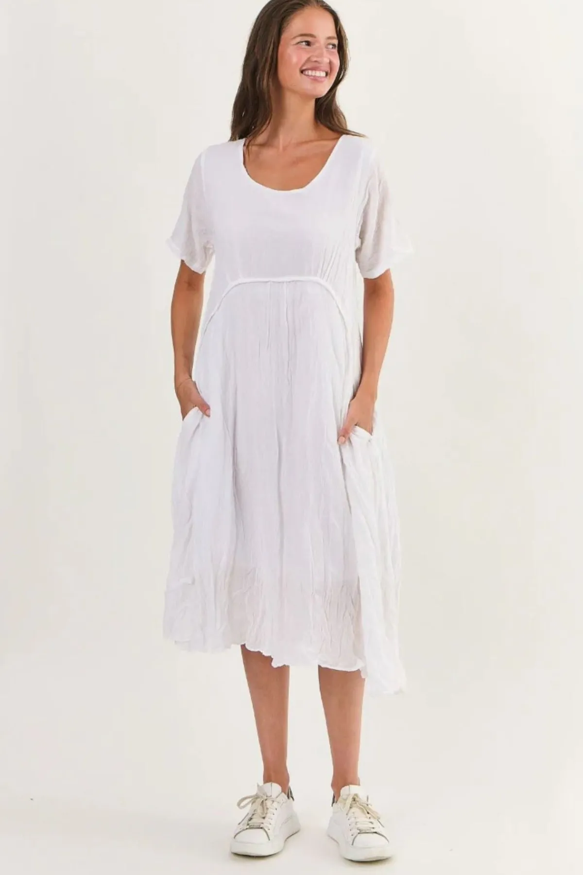 Easy charm, made to flatter. The Namastai Midi Dress is shaped with a defined waist, a soft scoop neckline, and flutter sleeves that move with ease. Crafted from breathable 100% crinkle cotton with hidden side pockets, it blends comfort and quiet elegance in one effortless piece.