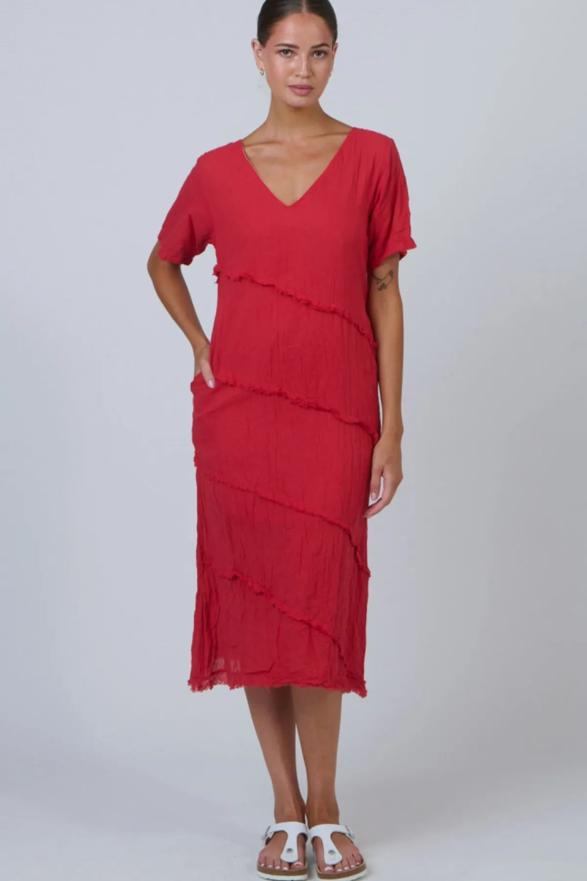 The dress that makes your casual days feel a little more special. The V-Neck Dress features diagonal raw-edge tiers cascading in artisanal style, with a flattering v-neckline, relaxed short sleeves, and a practical side pocket. The 100% crinkle cotton fabric drapes gracefully to a feminine midi length, offering versatile chic for any casual occasion.