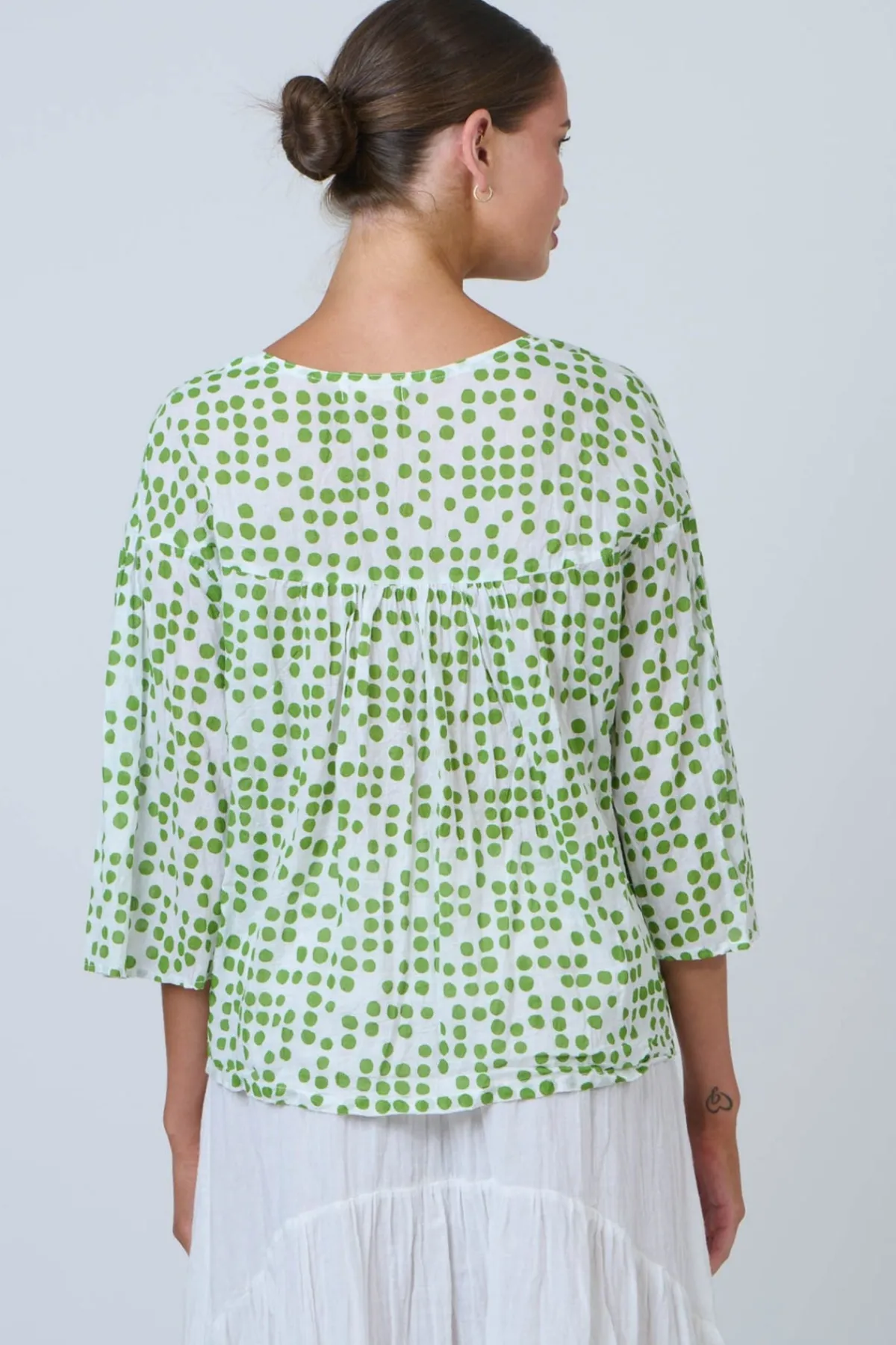 This 100% crinkle cotton Button Up Top shows off a carefree vibe with its relaxed V-neckline. Two charming wooden buttons let you decide between open or closed, while breezy three-quarter sleeves add a touch of flow. A sweet gathered detail above the bust creates a flattering, fun fit.