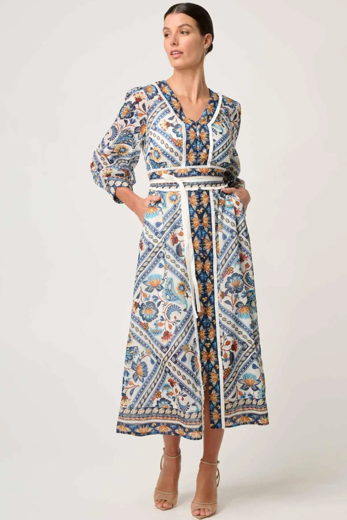 Step into effortless elegance with the Alexis Silk Cotton Midi Dress in Petinos Floros – where artisan-inspired florals meet refined modern tailoring. Crafted from a luxurious silk-cotton blend, this airy midi dress features a botanical mosaic of sun-drenched florals in hues of indigo, terracotta, and marigold. The silhouette is thoughtfully detailed with a contrast trim and a self-tie rope belt to define the waist, creating a flattering and feminine shape. Whether you’re wandering a coastal town or attending a garden soirée, the Alexis dress offers the perfect balance of laid-back grace and elevated charm.