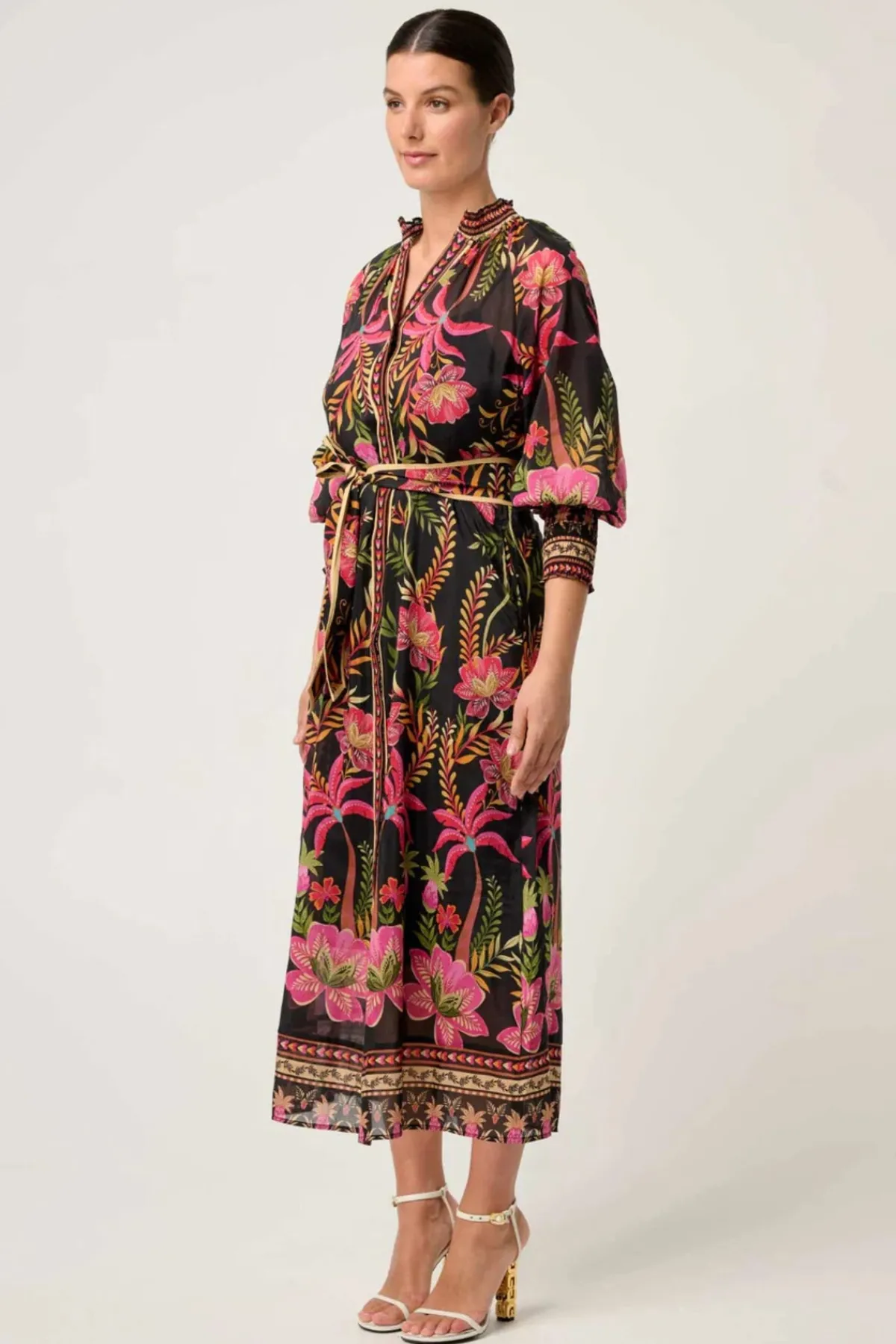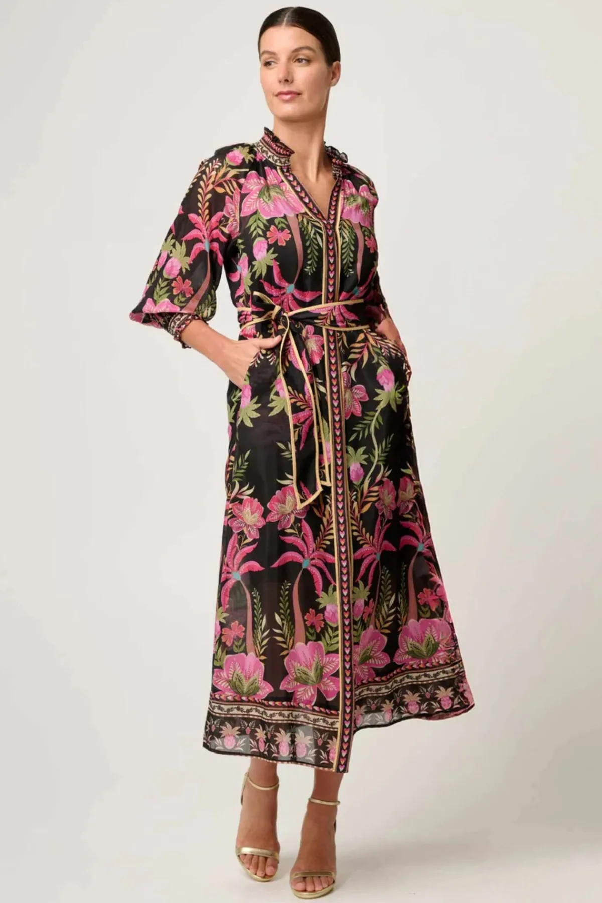 The Carmen Silk Cotton Dress in Anthos Lótos combines silk and cotton for a soft, elegant feel. Its A-line shape, self-tie waist, and front split create graceful movement, while elbow-length sleeves add subtle drama. Featuring a vibrant lotus print on charcoal, this dress suits summer events or resort wear, easily styled with heels or flats.