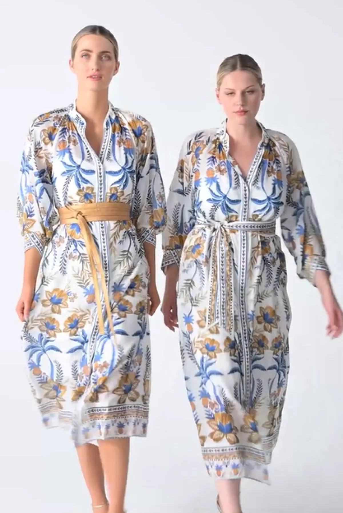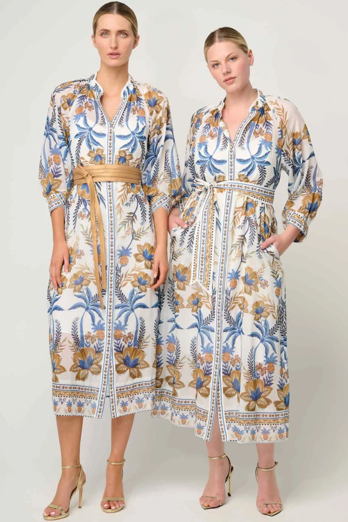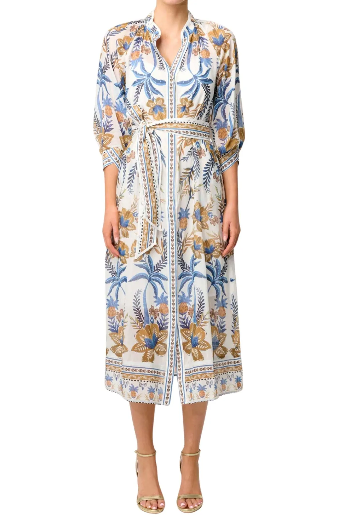 The Golden Medina print is a striking mix of golden tones and rich blue florals, inspired by artisanal patterns and exotic destinations. The design features a button-through front, allowing you to style it closed as a full-length dress or slightly open for a more relaxed, layered look. A removable self-tie belt cinches the waist, offering a customizable fit that flatters every figure. Finishing touches such as the contrast trim detailing and subtle blouson sleeves add depth and polish to this versatile wardrobe hero.