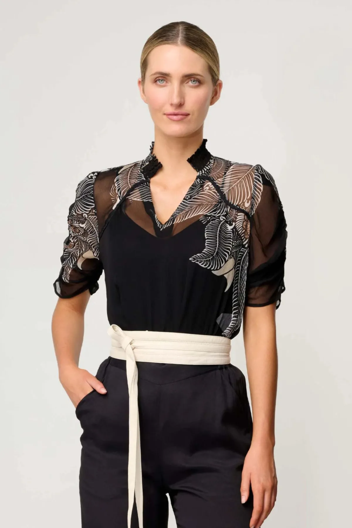 TheSamira Viscose Chiffon Sleeve Blouse in Onyx Casablancaembodies effortless sophistication with a touch of modern romance. Crafted from a luxurious viscose blend, this blouse features sheer chiffon sleeves that softly drape the arms, creating a light and ethereal silhouette perfect for both day and evening wear.
