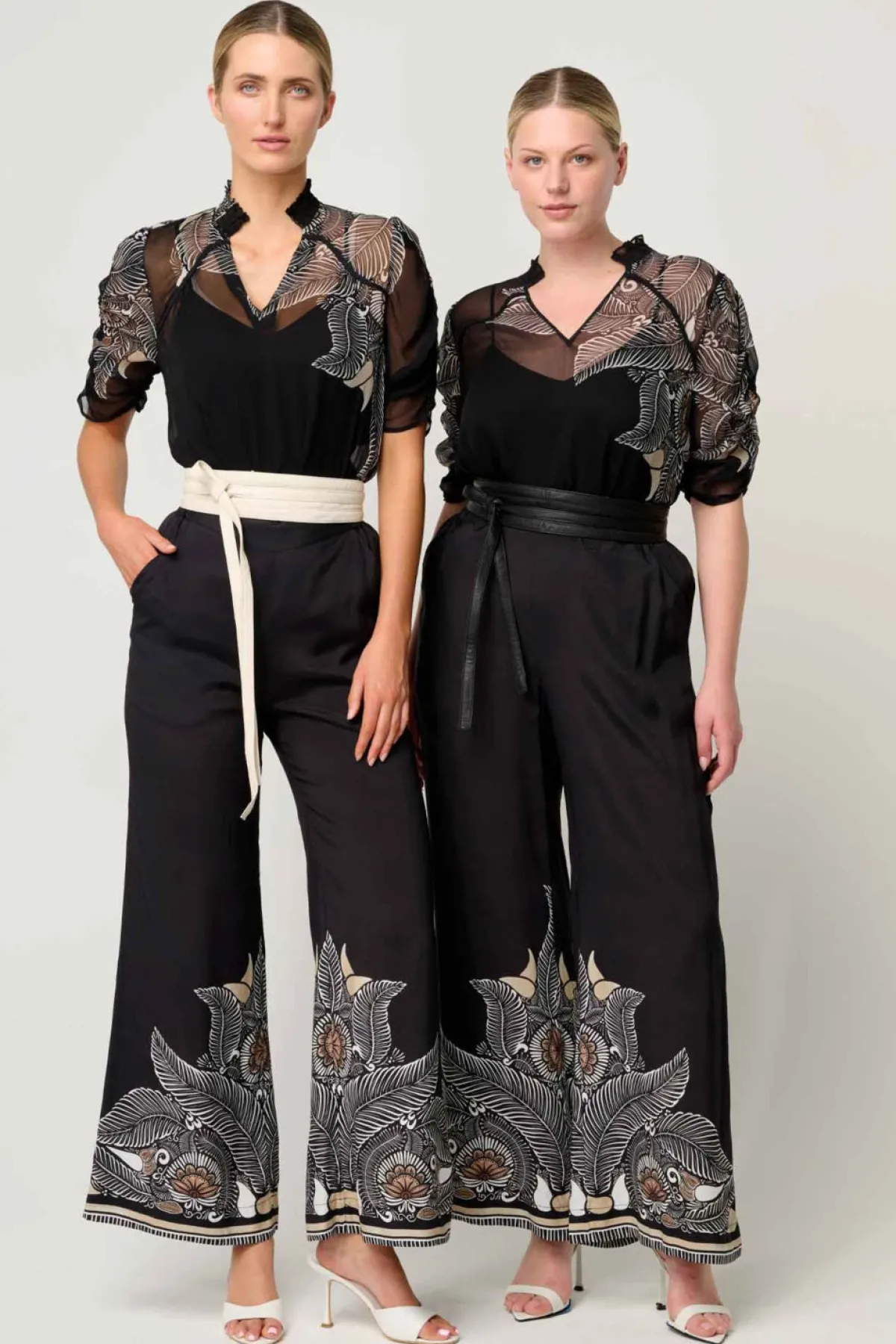 The Onyx Casablanca print, designed exclusively in Melbourne, showcases intricate botanical motifs in elegant neutral tones against a deep black base — a timeless palette that exudes refined glamour. The delicately gathered neckline and lace trim detailing highlight OnceWas’s signature craftsmanship, while the semi-sheer yoke and sleeve contrast add an alluring feminine touch.
