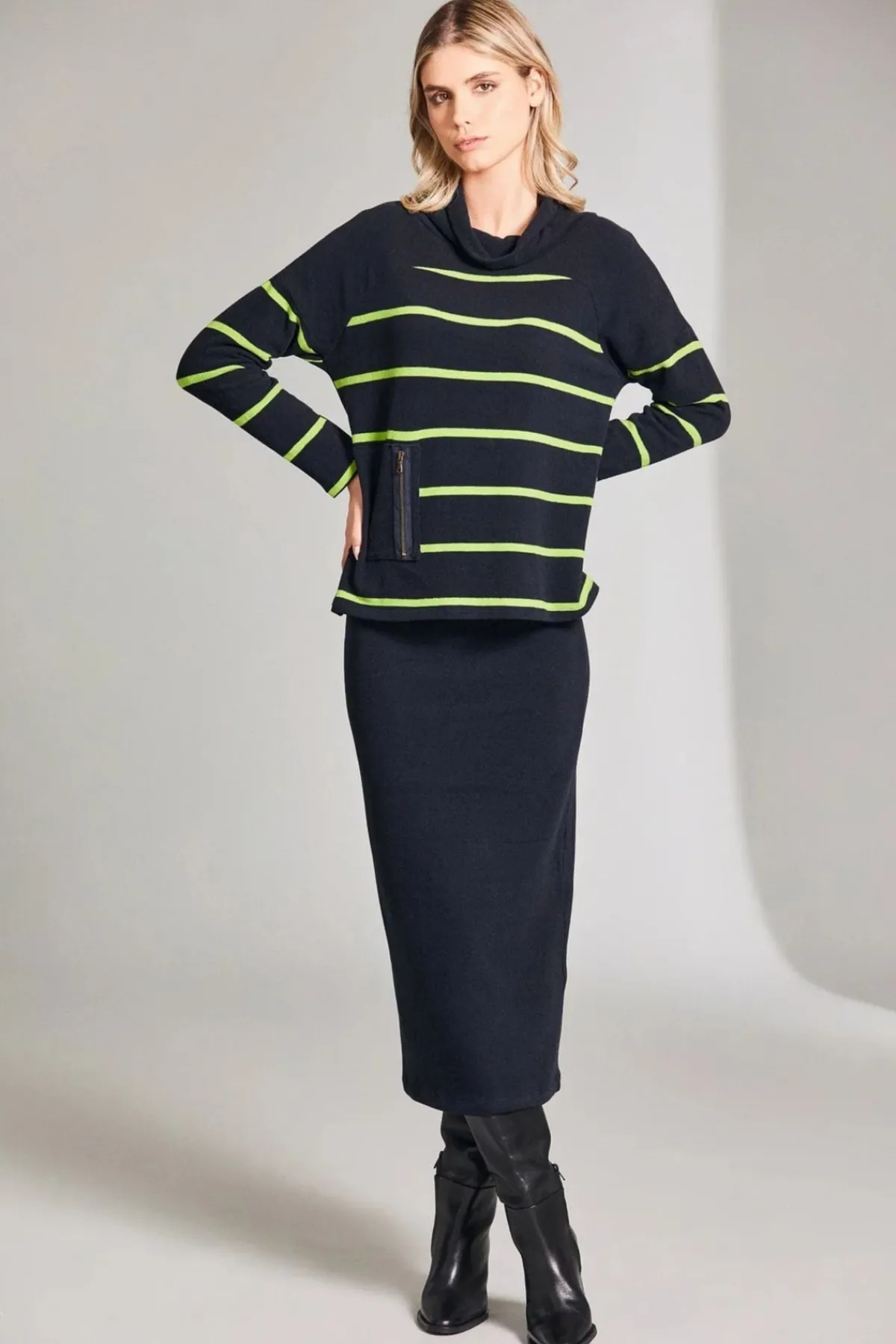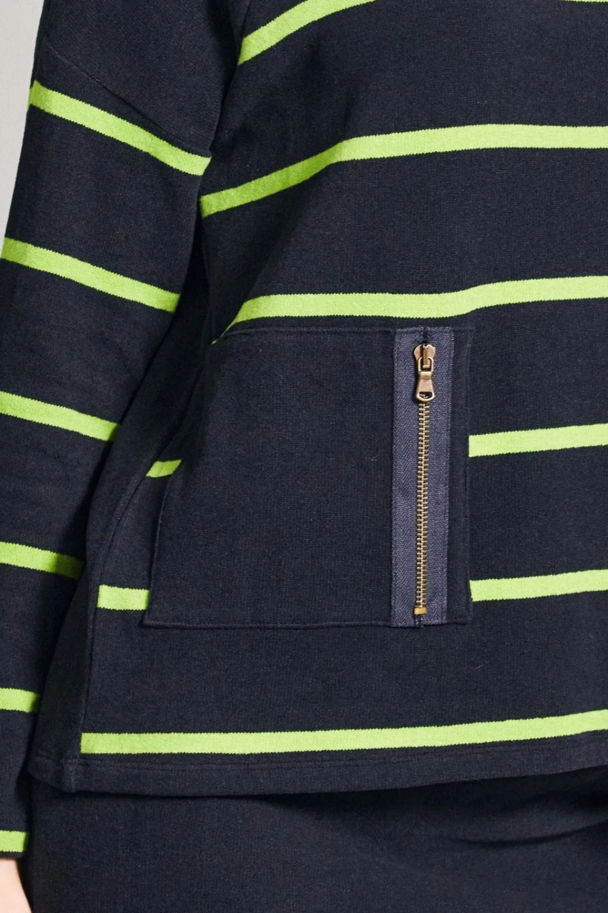 - Navy top with lime green stripes
