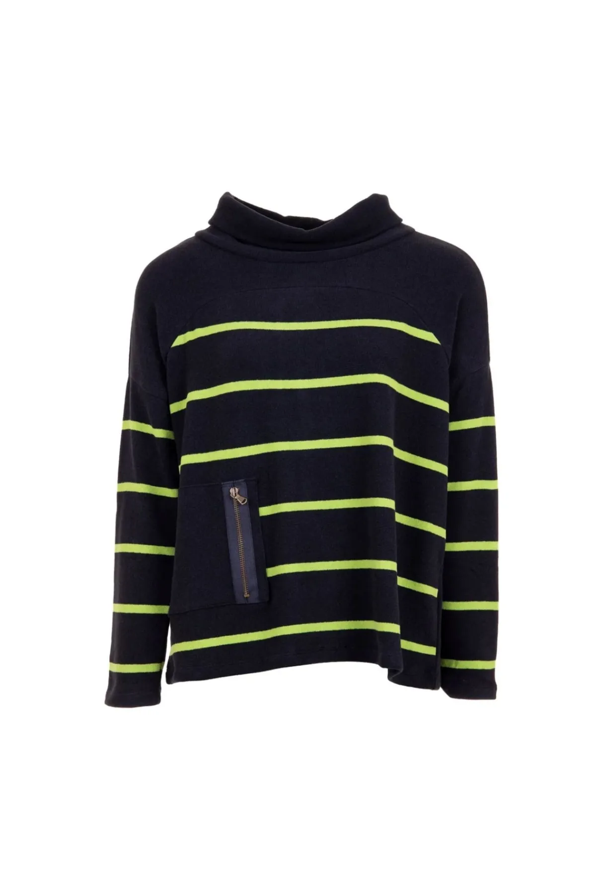 PERUZZI solid contrast stripe knit with cowl neck and zip pocket detail.