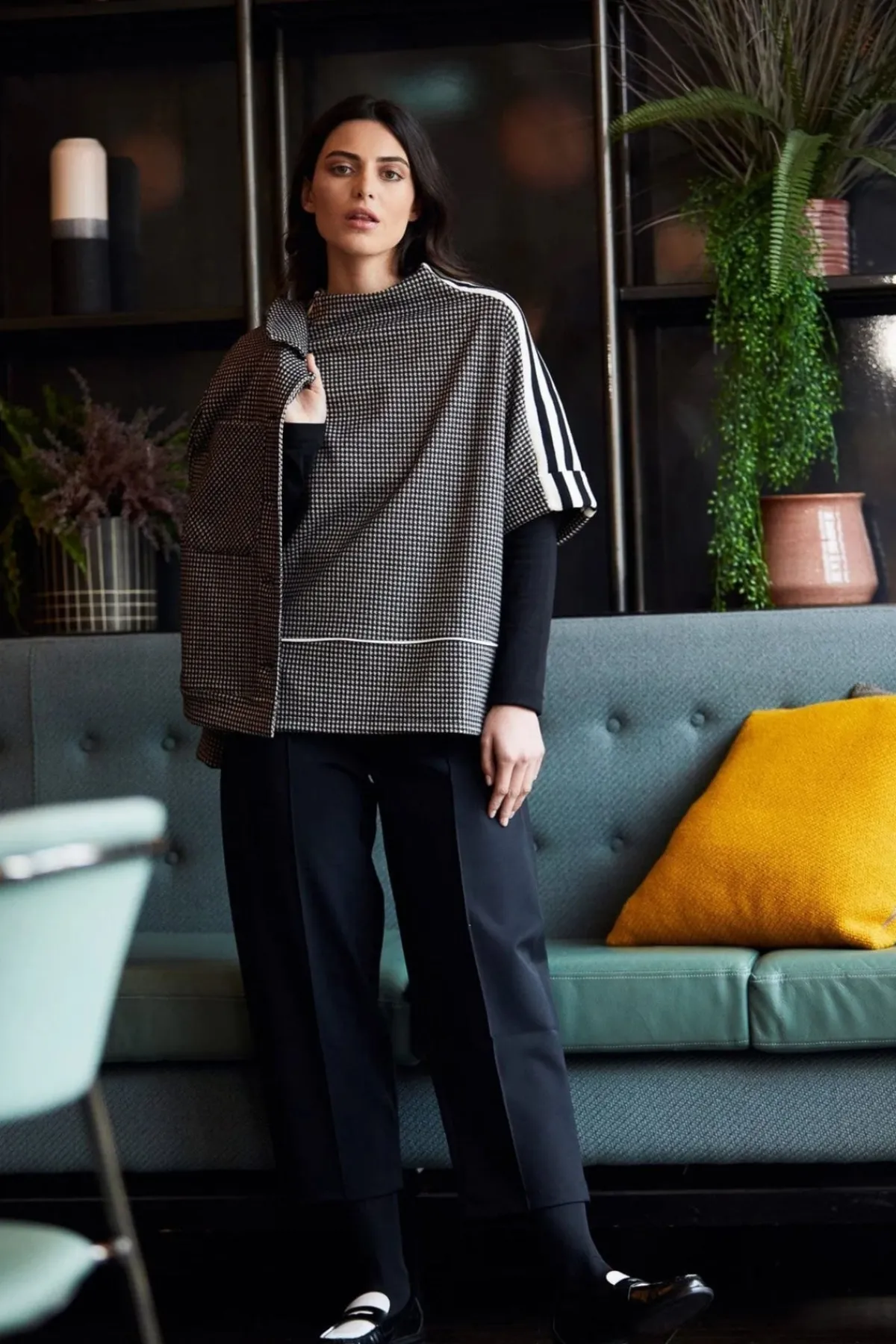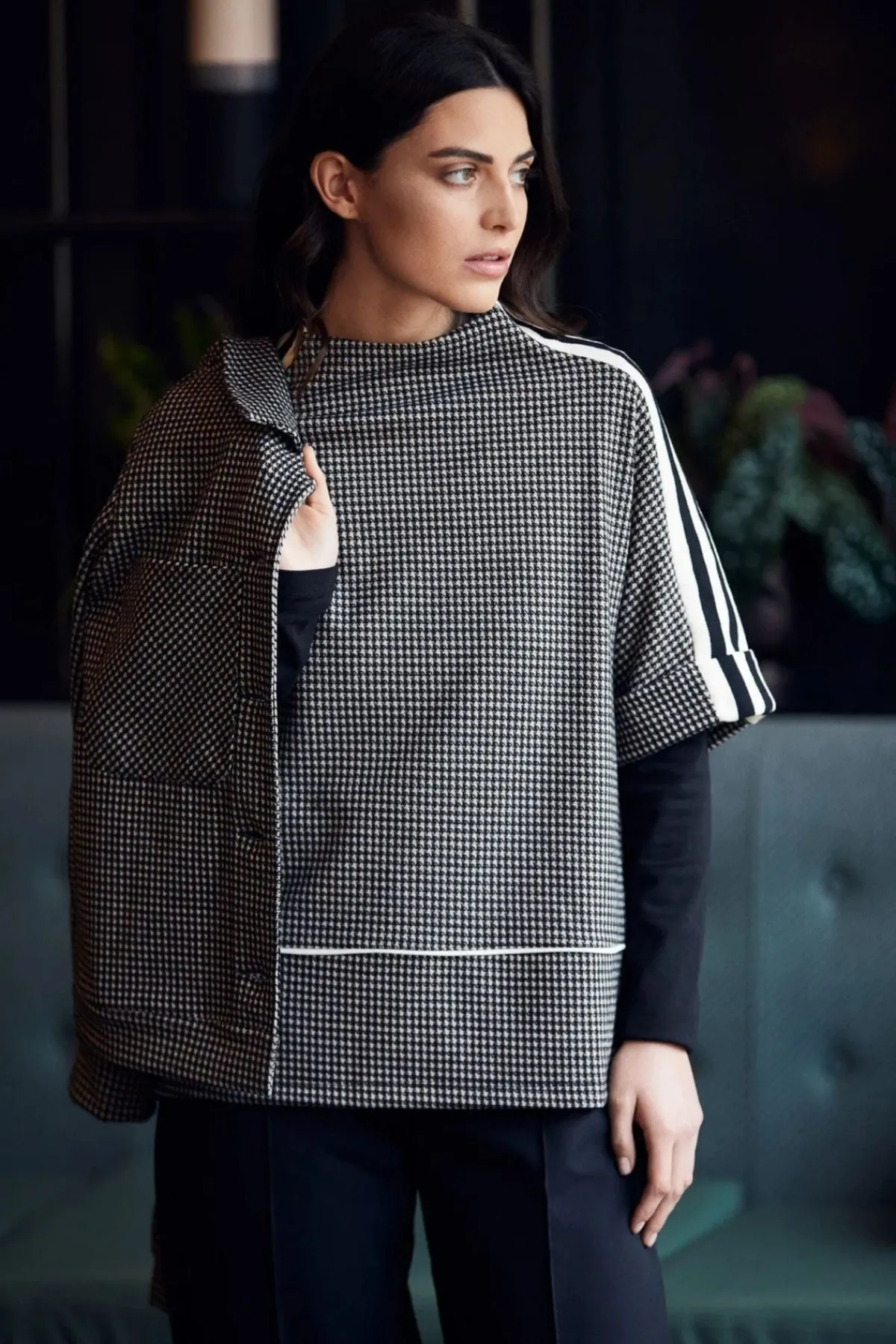 PERUZZI houndstooth top with a high neckline and contrasting sleeve stripe detail.