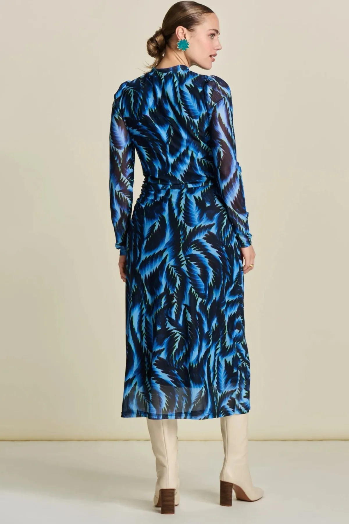 The blue midi dress features a unique handmade feather print. This dress is a real eye-catcher! The mesh fabric of the dress is made of recycled polyester, making this a more sustainable item.