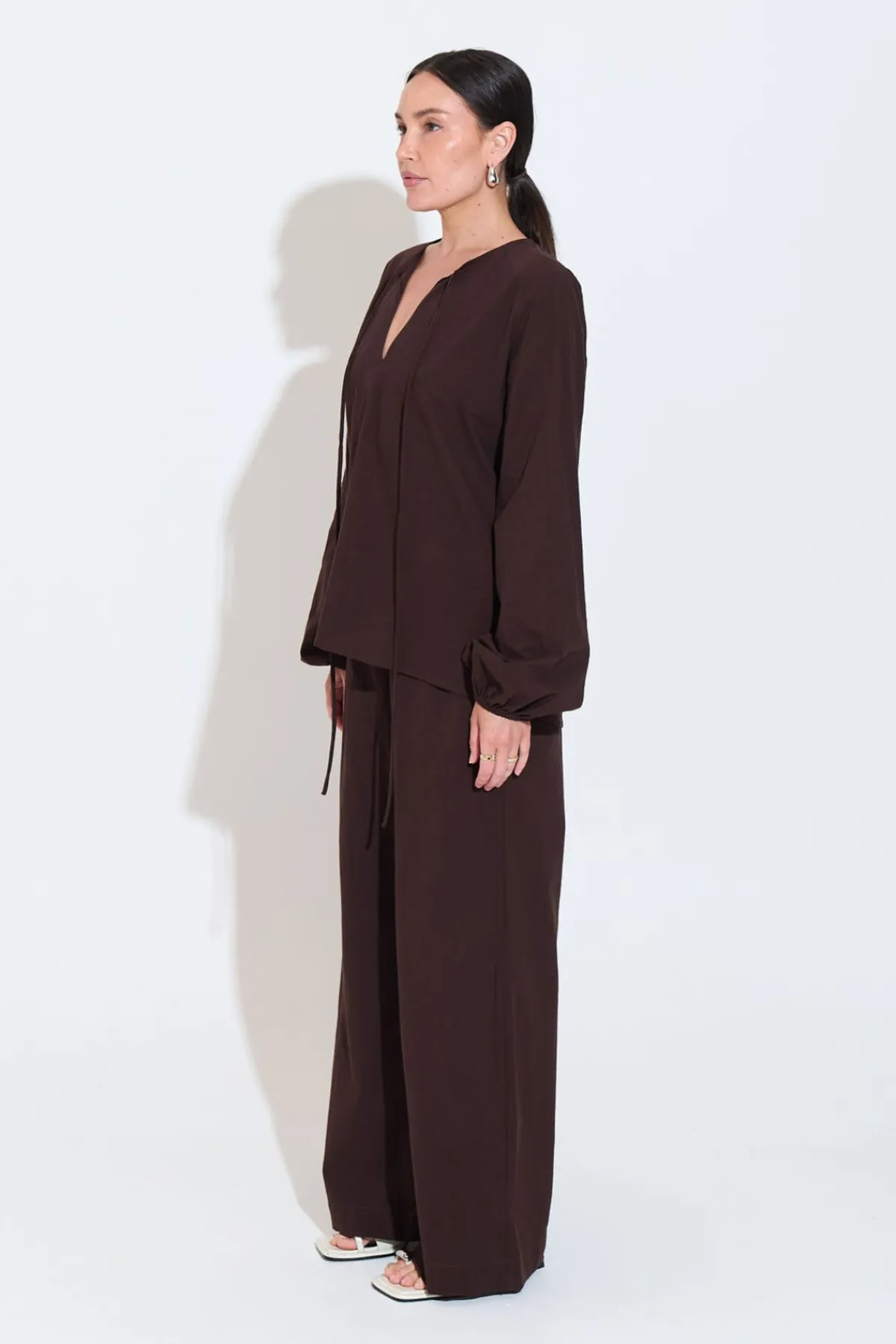 An effortless transeasonal look in breezy, lightweightbrushedcotton. Featuring a v-neck opening with front ties & balloon sleeve feature.