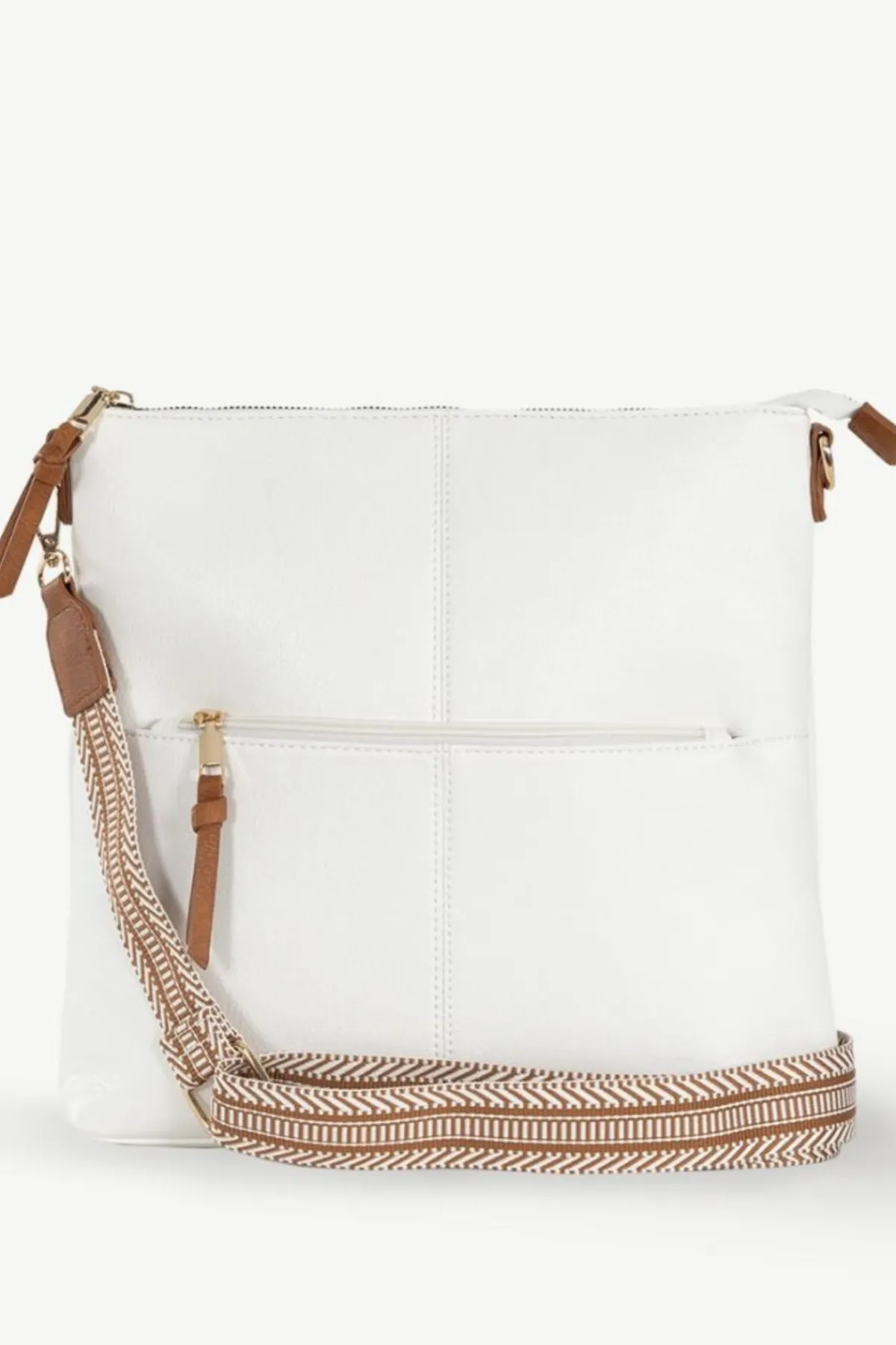 - External Features: The woven, patterned cotton cross body strap adds artistic flair to the bag.