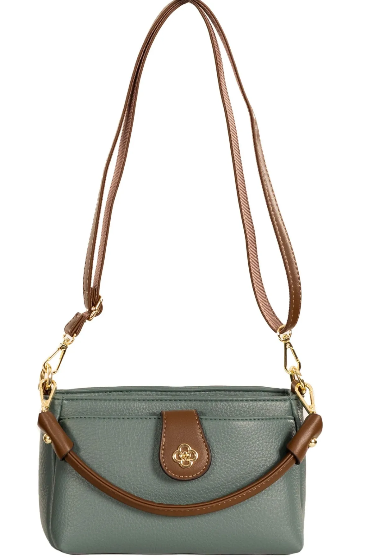 - External Features: The bag is divided into 3 pockets, two with zip closures and one with a tab closure. Chocolate brown is used as a highlight accent on all handles.