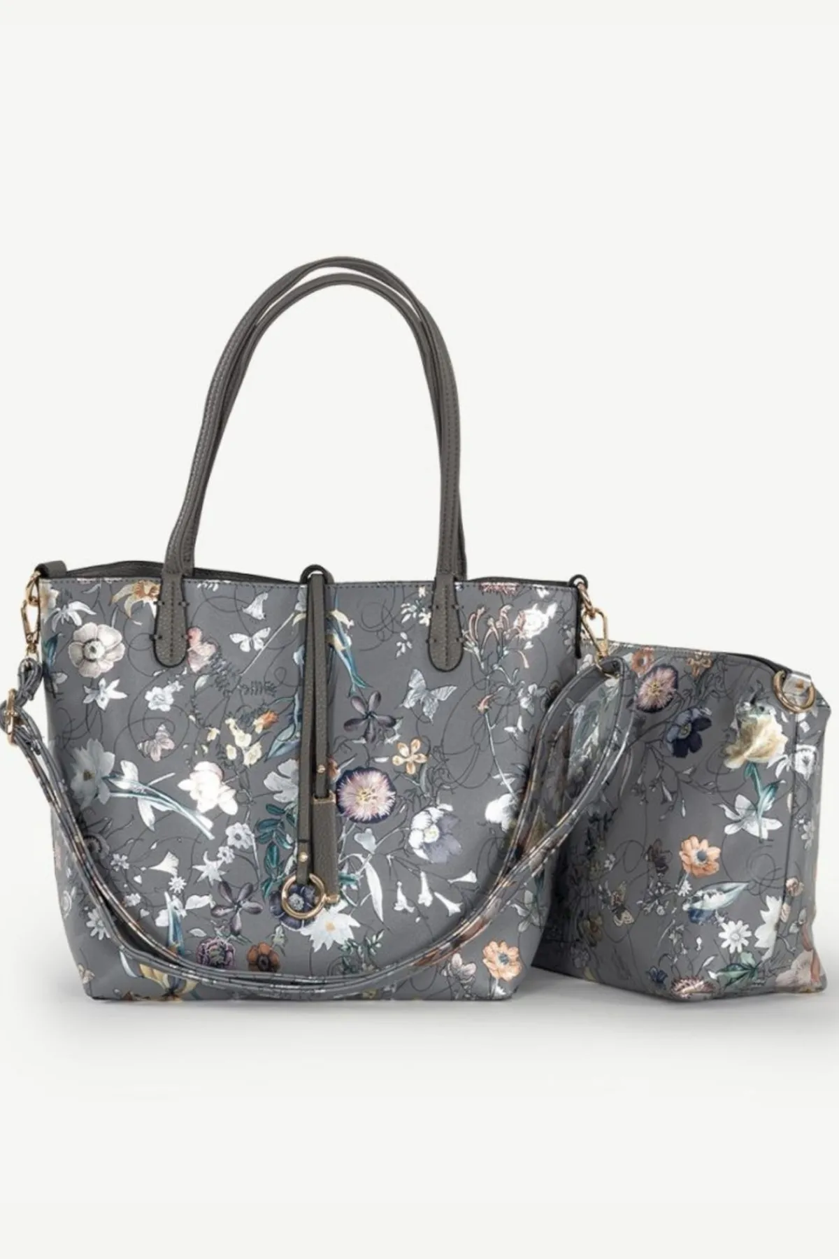 The Floral Gigi features a softly structured silhouette in floral fabric with subtle metallic highlights. Two handle options are included: a shoulder handle with a 21 cm drop, and a detachable crossbody strap (125 cm) that can be used with either the outer tote bag or the internal pouch.