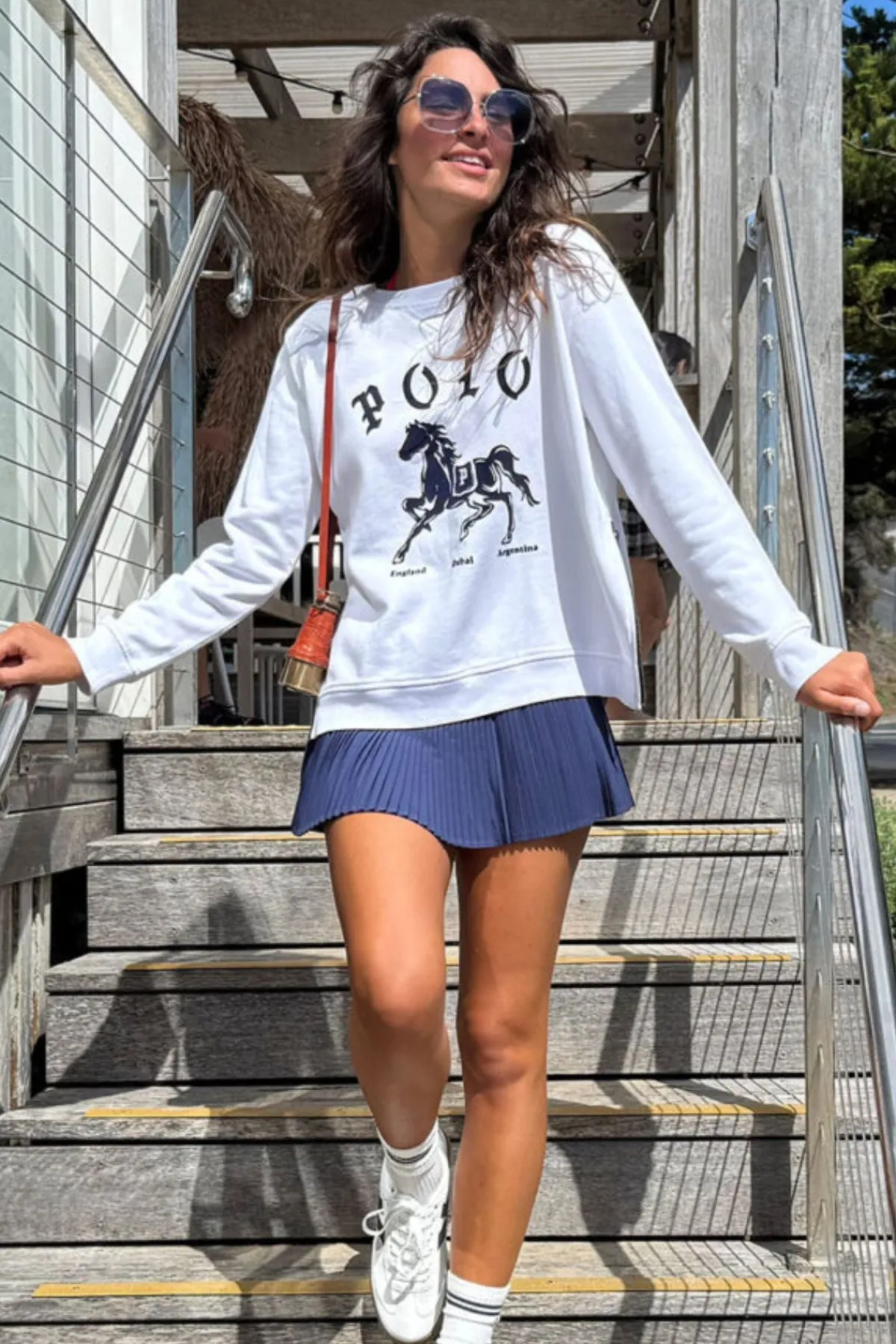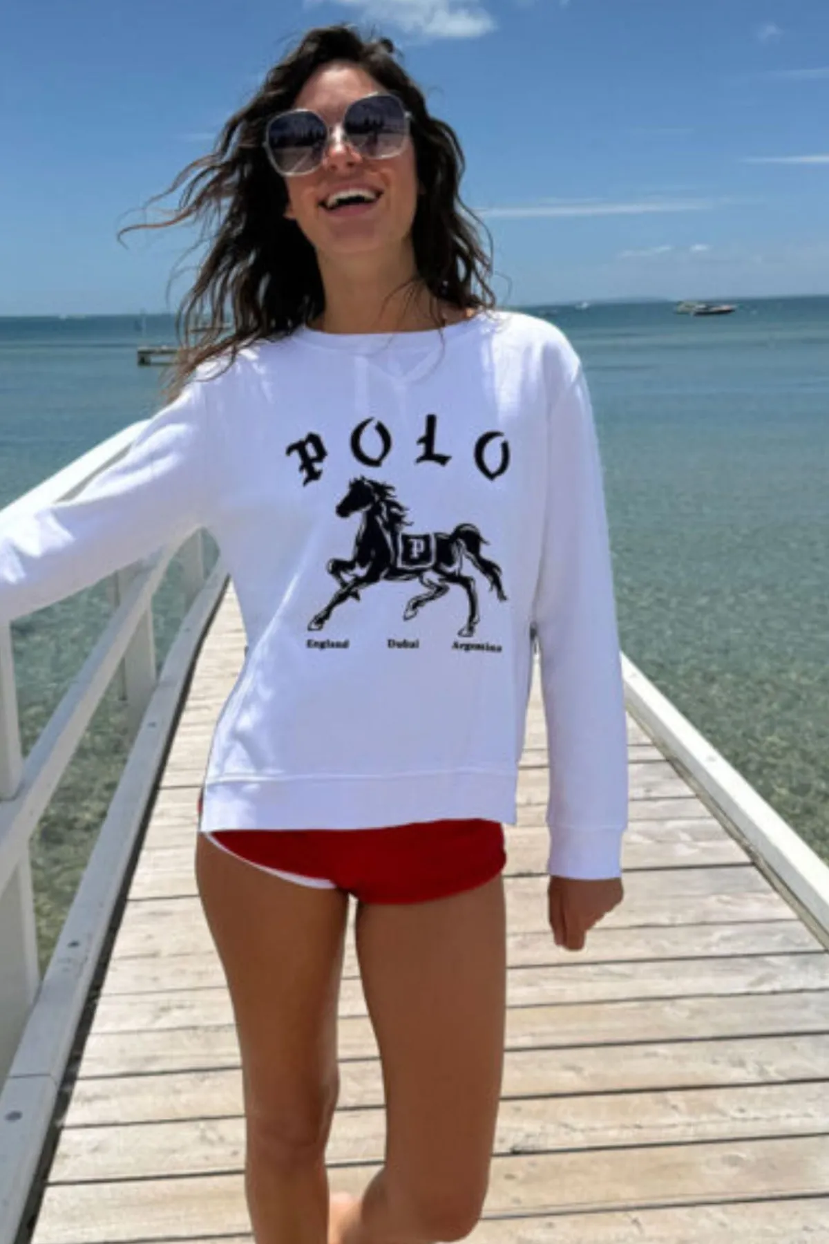 Indulge in the timeless and refined aesthetic of this cozy round neck sweater. The iconic polo horse emblem lends an air of sophistication to your ensemble, while the crisp white and navy hues offer versatility and elegance.