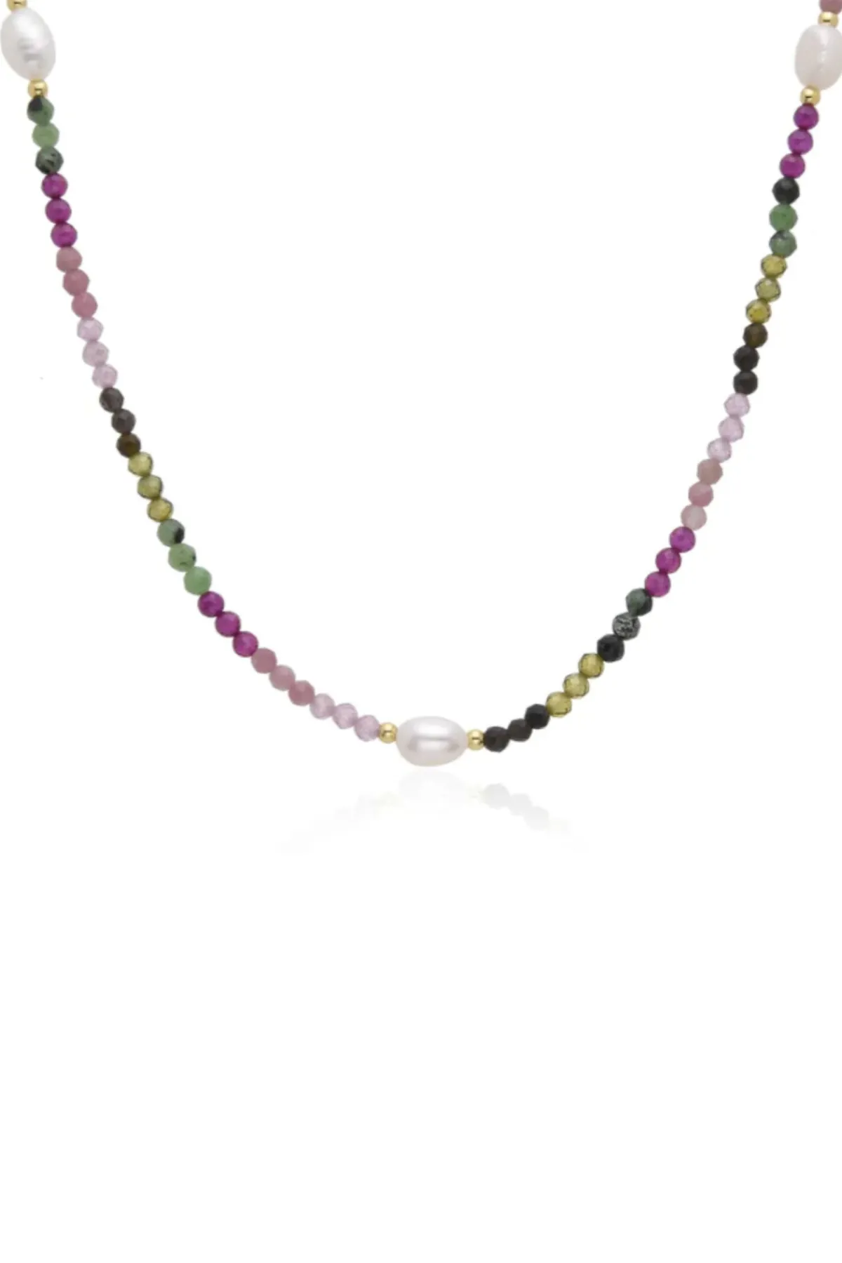 Elevate any outfit with the eye-catching DYNASTY NECKLACE. This long necklace features beautiful tourmaline and pearl accents for a touch of elegance. Perfect for adding a pop of color to your look, it’s a must-have accessory for any jewellery lover.