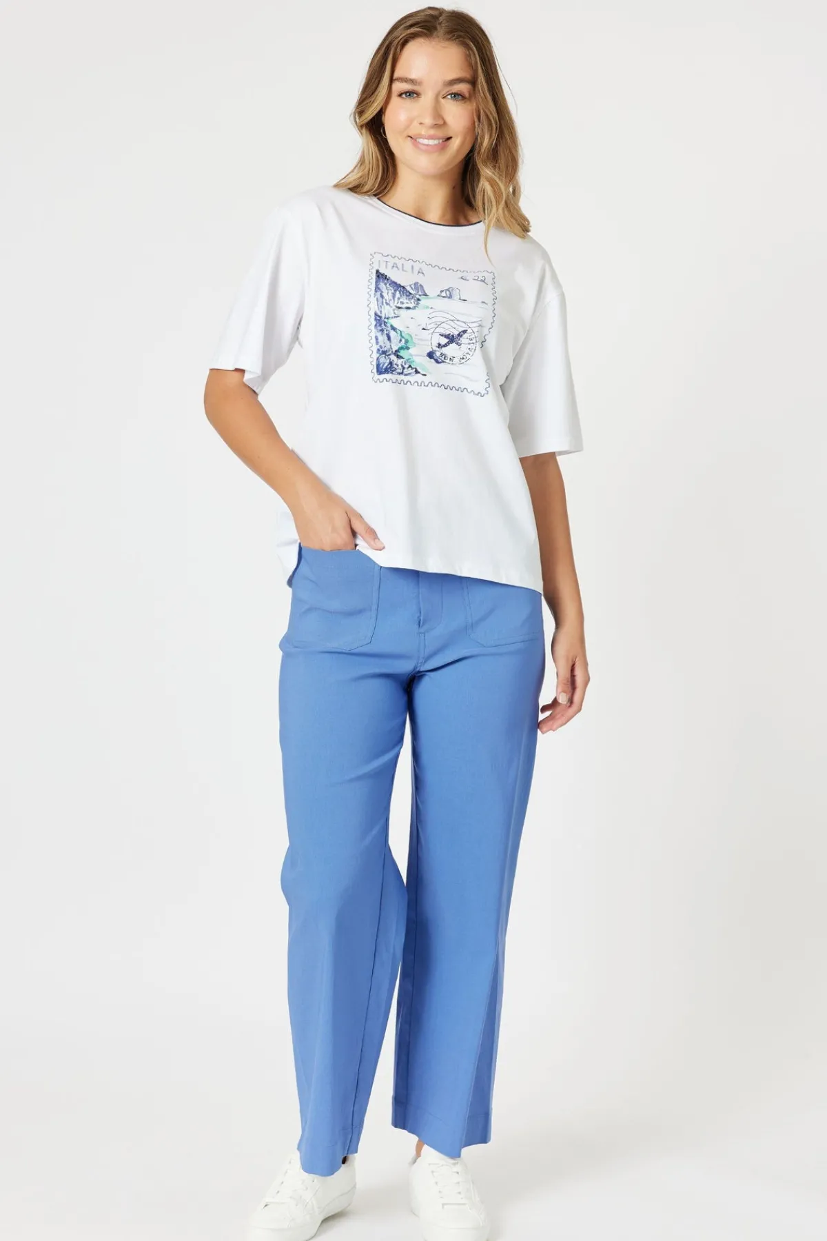 Celebrate la dolce vita with The Italia Tee, a crisp white cotton tee featuring a vintage Italian postage stamp print in shades of blue. Inspired by the stunning coastlines of Italy, this piece brings a touch of wanderlust to your everyday wardrobe. Lightweight and breathable, it features short sleeves and a round neckline finished with a navy trim for a polished detail.